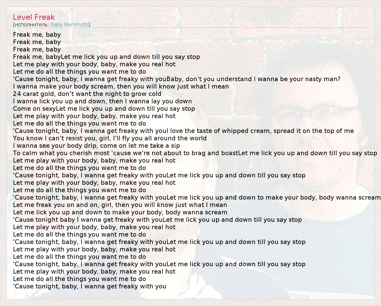 Freak me, baby Freak me, baby Freak me, baby Freak me, babyLet me lick you up and down till you say stop Let me play with your body, baby, make you real hot Let me do all the things you want me to do 'Cause tonight, baby, I wanna get freaky with youBaby, don't you understand I wanna be your nasty man? I wanna make your body scream, then you will know just what I mean 24 carat gold, don't want the night to grow cold I wanna lick you up and down, then I wanna lay you down Come on sexyLet me lick you up and down till you say stop Let me play with your body, baby, make you real hot Let me do all the things you want me to do 'Cause tonight, baby, I wanna get freaky with youI love the taste of whipped cream, spread it on the top of me You know I can't resist you, girl, I'll fly you all around the world I wanna see your body drip, come on let me take a sip To calm what you cherish most 'cause we're not about to brag and boastLet me lick you up and down till you say stop Let me play with your body, baby, make you real hot Let me do all the things you want me to do 'Cause tonight, baby, I wanna get freaky with youLet me lick you up and down till you say stop Let me play with your body, baby, make you real hot Let me do all the things you want me to do 'Cause tonight, baby, I wanna get freaky with youLet me lick you up and down to make your body, body wanna scream Let me freak you on and on, girl, then you will know just what I mean Let me lick you up and down to make your body, body wanna scream 'Cause tonight baby I wanna get freaky with youLet me lick you up and down till you say stop Let me play with your body, baby, make you real hot Let me do all the things you want me to do 'Cause tonight, baby, I wanna get freaky with youLet me lick you up and down till you say stop Let me play with your body, baby, make you real hot Let me do all the things you want me to do 'Cause tonight, baby, I wanna get freaky with youLet me lick you up and down till you say stop Let me play with your body, baby, make you real hot Let me do all the things you want me to do 'Cause tonight, baby, I wanna get freaky with you