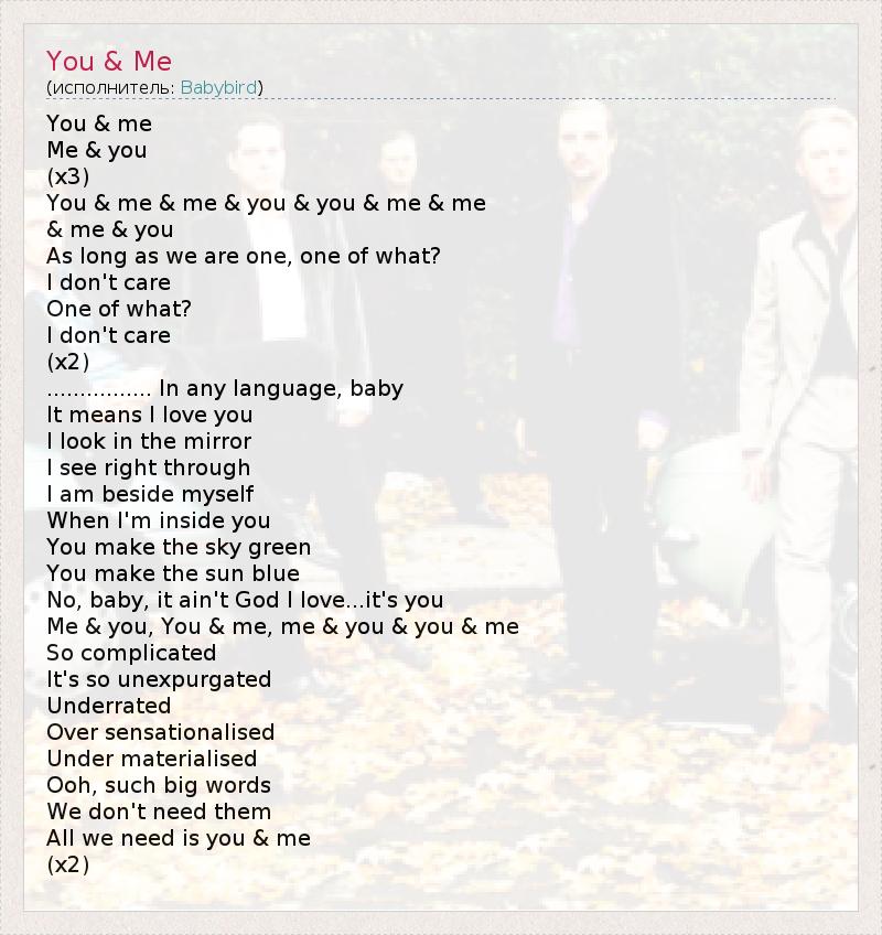 You & me Me & you (x3) You & me & me & you & you & me & me & me & you As long as we are one, one of what? I don't care One of what? I don't care (x2) ................ In any language, baby It means I love you I look in the mirror I see right through I am beside myself When I'm inside you You make the sky green You make the sun blue No, baby, it ain't God I love...it's you Me & you, You & me, me & you & you & me So complicated It's so unexpurgated Underrated Over sensationalised Under materialised Ooh, such big words We don't need them All we need is you & me (x2)