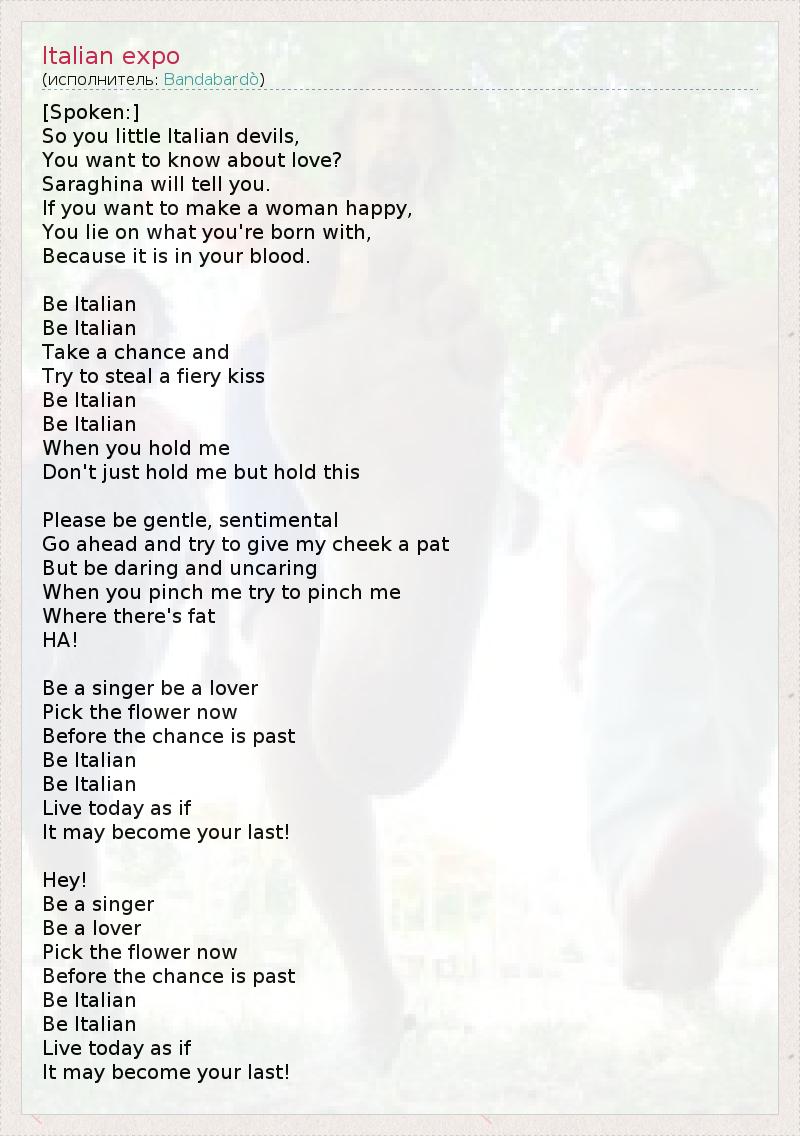 [На словах:] Итак, вы, маленькие итальянские дьяволята, Хотите узнать о любви? Сарагина расскажет вам. Если хочешь сделать женщину счастливой, Положись на врождённое, Потому что это в твоей крови. Будь итальянцем, Будь итальянцем. Воспользуйся шансом И попытайся добиться пламенного поцелуя. Будь итальянцем, Будь итальянцем. Когда сжимаешь меня в объятиях, Не ПРОСТО обнимай меня, обнимай ТАК! Пожалуйста, будь нежен, чувственен, Подолжай, шлёпни меня по попке! Но будь дерзок, беззаботен, Если хочешь ущипнуть меня, Ущипни за что-нибудь мягкое! ХА! Будь поэтом, будь любовником, Сорви цветок сейчас, Пока есть шанс! Будь итальянцем, Будь итальянцем! Живи так, словно сегодняшний день - Последний в твоей жизни! Эй! Будь поэтом! Будь любовником! Сорви цветок сейчас, Пока есть шанс! Будь итальянцем! Будь итальянцем! Живи так, словно сегодняшний день - Последний в твоей жизни!