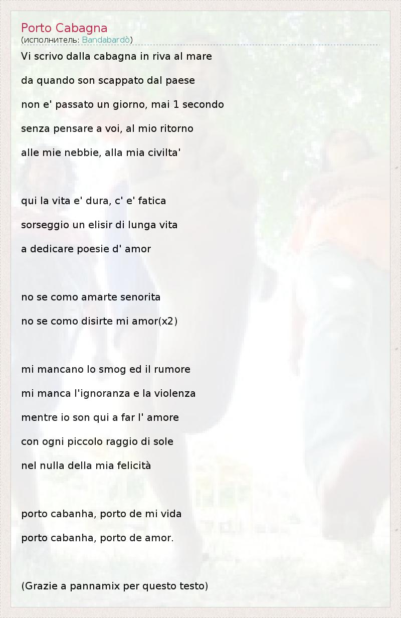 Vi scrivo dalla cabagna in riva al mare da quando son scappato dal paese non e' passato un giorno, mai 1 secondo senza pensare a voi, al mio ritorno alle mie nebbie, alla mia civilta' qui la vita e' dura, c' e' fatica sorseggio un elisir di lunga vita a dedicare poesie d' amor no se como amarte senorita no se como disirte mi amor(x2) mi mancano lo smog ed il rumore mi manca l'ignoranza e la violenza mentre io son qui a far l' amore con ogni piccolo raggio di sole nel nulla della mia felicità porto cabanha, porto de mi vida porto cabanha, porto de amor. (Grazie a pannamix per questo testo)