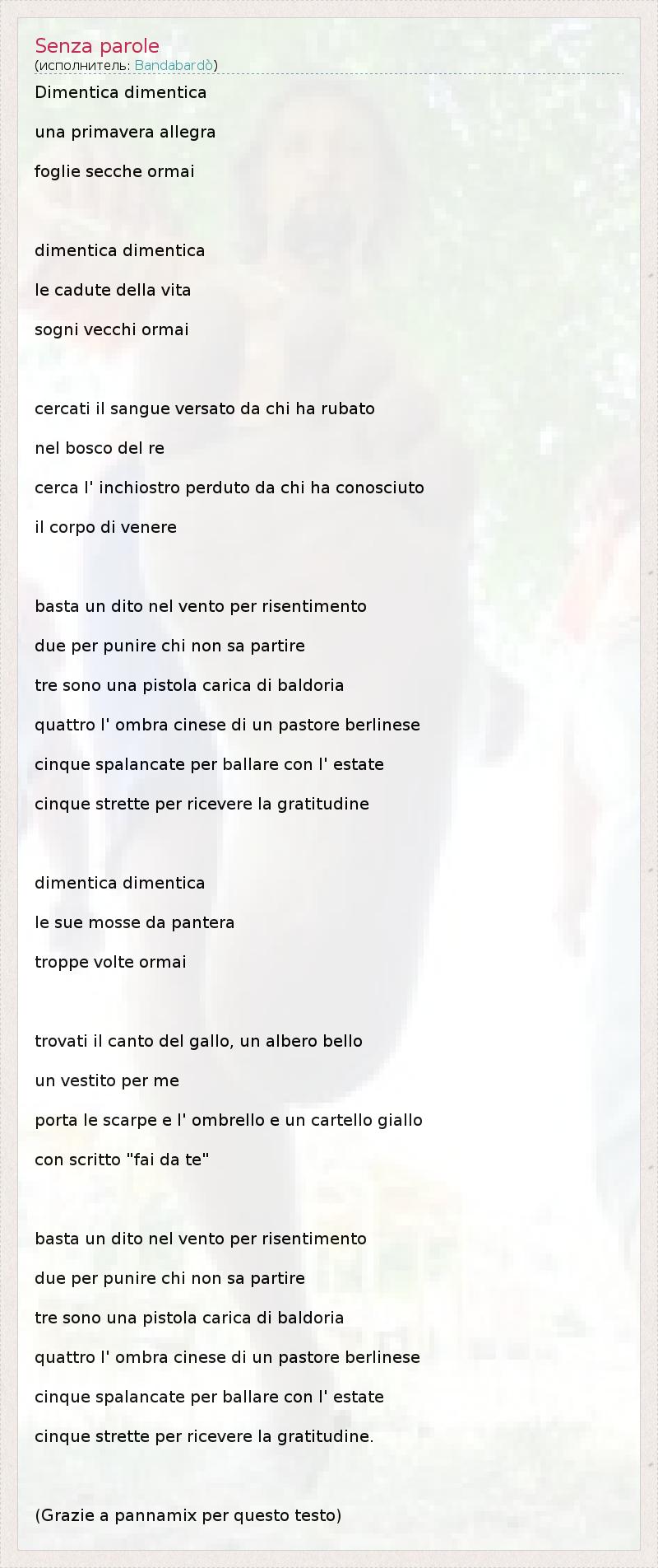 Dimentica dimentica una primavera allegra foglie secche ormai dimentica dimentica le cadute della vita sogni vecchi ormai cercati il sangue versato da chi ha rubato nel bosco del re cerca l' inchiostro perduto da chi ha conosciuto il corpo di venere basta un dito nel vento per risentimento due per punire chi non sa partire tre sono una pistola carica di baldoria quattro l' ombra cinese di un pastore berlinese cinque spalancate per ballare con l' estate cinque strette per ricevere la gratitudine dimentica dimentica le sue mosse da pantera troppe volte ormai trovati il canto del gallo, un albero bello un vestito per me porta le scarpe e l' ombrello e un cartello giallo con scritto "fai da te" basta un dito nel vento per risentimento due per punire chi non sa partire tre sono una pistola carica di baldoria quattro l' ombra cinese di un pastore berlinese cinque spalancate per ballare con l' estate cinque strette per ricevere la gratitudine. (Grazie a pannamix per questo testo)