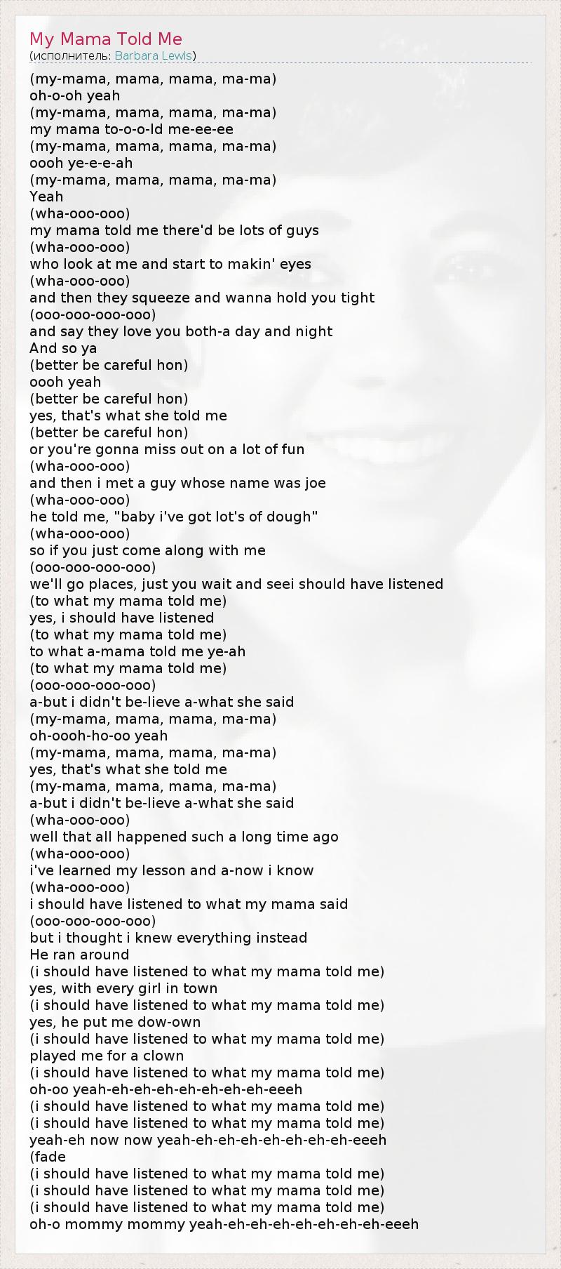 (my-mama, mama, mama, ma-ma) oh-o-oh yeah (my-mama, mama, mama, ma-ma) my mama to-o-o-ld me-ee-ee (my-mama, mama, mama, ma-ma) oooh ye-e-e-ah (my-mama, mama, mama, ma-ma) Yeah (wha-ooo-ooo) my mama told me there'd be lots of guys (wha-ooo-ooo) who look at me and start to makin' eyes (wha-ooo-ooo) and then they squeeze and wanna hold you tight (ooo-ooo-ooo-ooo) and say they love you both-a day and night And so ya (better be careful hon) oooh yeah (better be careful hon) yes, that's what she told me (better be careful hon) or you're gonna miss out on a lot of fun (wha-ooo-ooo) and then i met a guy whose name was joe (wha-ooo-ooo) he told me, "baby i've got lot's of dough" (wha-ooo-ooo) so if you just come along with me (ooo-ooo-ooo-ooo) we'll go places, just you wait and seei should have listened (to what my mama told me) yes, i should have listened (to what my mama told me) to what a-mama told me ye-ah (to what my mama told me) (ooo-ooo-ooo-ooo) a-but i didn't be-lieve a-what she said (my-mama, mama, mama, ma-ma) oh-oooh-ho-oo yeah (my-mama, mama, mama, ma-ma) yes, that's what she told me (my-mama, mama, mama, ma-ma) a-but i didn't be-lieve a-what she said (wha-ooo-ooo) well that all happened such a long time ago (wha-ooo-ooo) i've learned my lesson and a-now i know (wha-ooo-ooo) i should have listened to what my mama said (ooo-ooo-ooo-ooo) but i thought i knew everything instead He ran around (i should have listened to what my mama told me) yes, with every girl in town (i should have listened to what my mama told me) yes, he put me dow-own (i should have listened to what my mama told me) played me for a clown (i should have listened to what my mama told me) oh-oo yeah-eh-eh-eh-eh-eh-eh-eh-eeeh (i should have listened to what my mama told me) (i should have listened to what my mama told me) yeah-eh now now yeah-eh-eh-eh-eh-eh-eh-eh-eeeh (fade (i should have listened to what my mama told me) (i should have listened to what my mama told me) (i should have listened to what my mama told me) oh-o mommy mommy yeah-eh-eh-eh-eh-eh-eh-eh-eeeh
