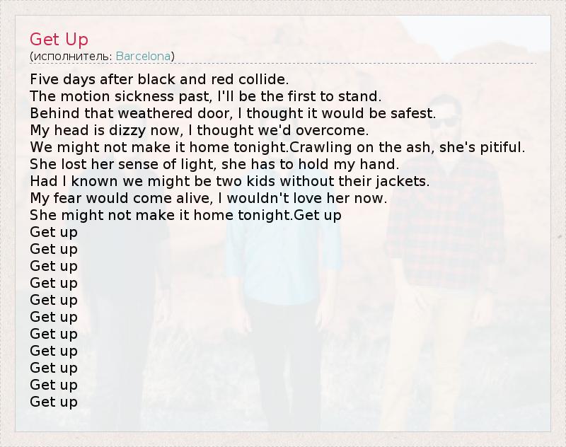 Five days after black and red collide. The motion sickness past, I'll be the first to stand. Behind that weathered door, I thought it would be safest. My head is dizzy now, I thought we'd overcome. We might not make it home tonight.Crawling on the ash, she's pitiful. She lost her sense of light, she has to hold my hand. Had I known we might be two kids without their jackets. My fear would come alive, I wouldn't love her now. She might not make it home tonight.Get up Get up Get up Get up Get up Get up Get up Get up Get up Get up Get up Get up