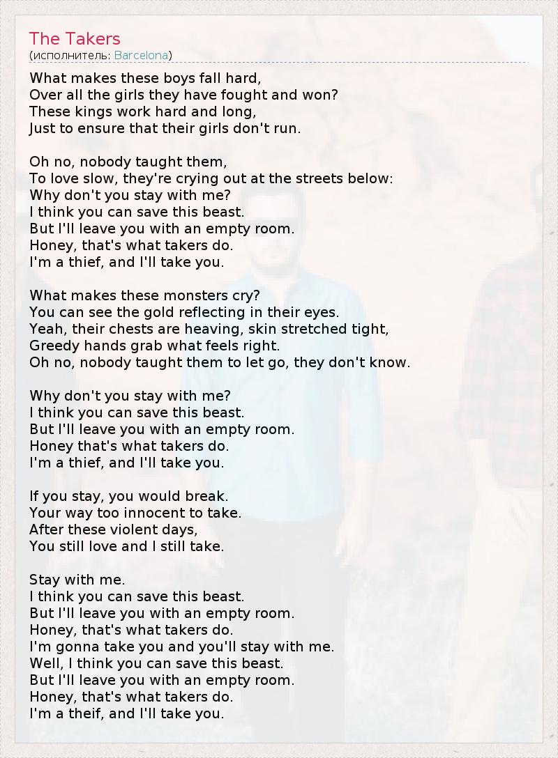 What makes these boys fall hard, Over all the girls they have fought and won? These kings work hard and long, Just to ensure that their girls don't run. Oh no, nobody taught them, To love slow, they're crying out at the streets below: Why don't you stay with me? I think you can save this beast. But I'll leave you with an empty room. Honey, that's what takers do. I'm a thief, and I'll take you. What makes these monsters cry? You can see the gold reflecting in their eyes. Yeah, their chests are heaving, skin stretched tight, Greedy hands grab what feels right. Oh no, nobody taught them to let go, they don't know. Why don't you stay with me? I think you can save this beast. But I'll leave you with an empty room. Honey that's what takers do. I'm a thief, and I'll take you. If you stay, you would break. Your way too innocent to take. After these violent days, You still love and I still take. Stay with me. I think you can save this beast. But I'll leave you with an empty room. Honey, that's what takers do. I'm gonna take you and you'll stay with me. Well, I think you can save this beast. But I'll leave you with an empty room. Honey, that's what takers do. I'm a theif, and I'll take you.