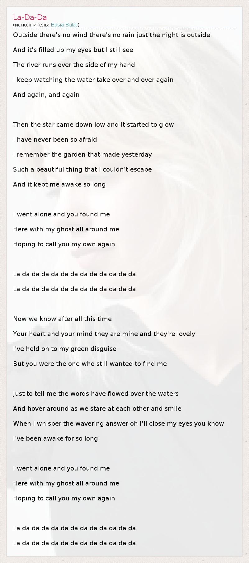 Outside there's no wind there's no rain just the night is outside And it's filled up my eyes but I still see The river runs over the side of my hand I keep watching the water take over and over again And again, and again Then the star came down low and it started to glow I have never been so afraid I remember the garden that made yesterday Such a beautiful thing that I couldn't escape And it kept me awake so long I went alone and you found me Here with my ghost all around me Hoping to call you my own again La da da da da da da da da da da da da La da da da da da da da da da da da da Now we know after all this time Your heart and your mind they are mine and they're lovely I've held on to my green disguise But you were the one who still wanted to find me Just to tell me the words have flowed over the waters And hover around as we stare at each other and smile When I whisper the wavering answer oh I'll close my eyes you know I've been awake for so long I went alone and you found me Here with my ghost all around me Hoping to call you my own again La da da da da da da da da da da da da La da da da da da da da da da da da da