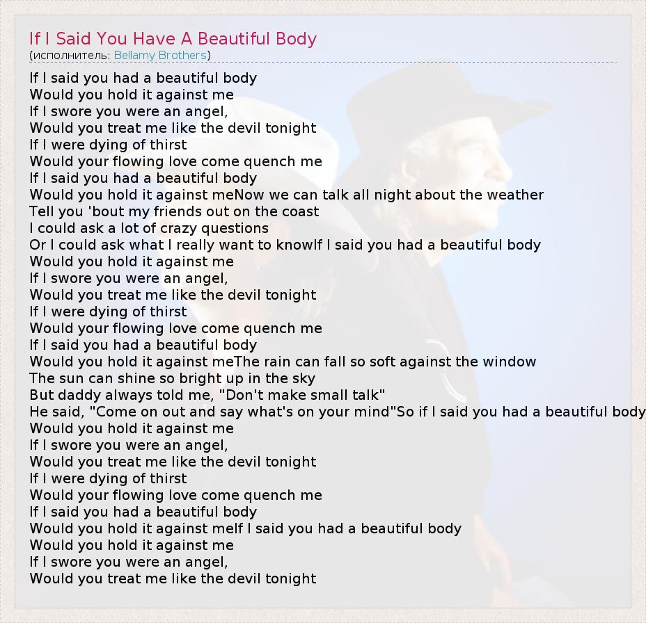 If I said you had a beautiful body Would you hold it against me If I swore you were an angel, Would you treat me like the devil tonight If I were dying of thirst Would your flowing love come quench me If I said you had a beautiful body Would you hold it against meNow we can talk all night about the weather Tell you 'bout my friends out on the coast I could ask a lot of crazy questions Or I could ask what I really want to knowIf I said you had a beautiful body Would you hold it against me If I swore you were an angel, Would you treat me like the devil tonight If I were dying of thirst Would your flowing love come quench me If I said you had a beautiful body Would you hold it against meThe rain can fall so soft against the window The sun can shine so bright up in the sky But daddy always told me, "Don't make small talk" He said, "Come on out and say what's on your mind"So if I said you had a beautiful body Would you hold it against me If I swore you were an angel, Would you treat me like the devil tonight If I were dying of thirst Would your flowing love come quench me If I said you had a beautiful body Would you hold it against meIf I said you had a beautiful body Would you hold it against me If I swore you were an angel, Would you treat me like the devil tonight