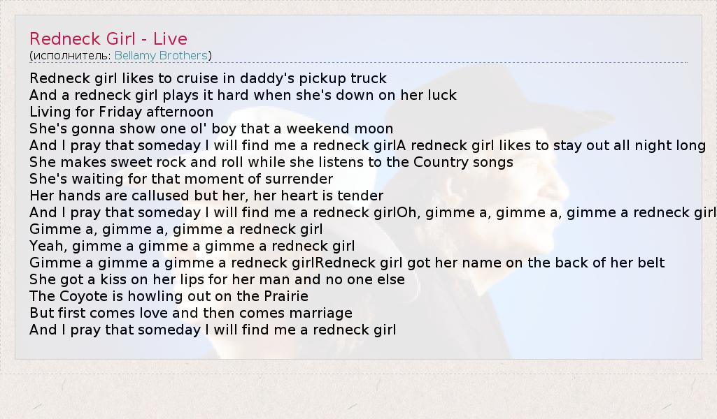 А как ты думаешь, о чем песня "Redneck Girl - Live" ?