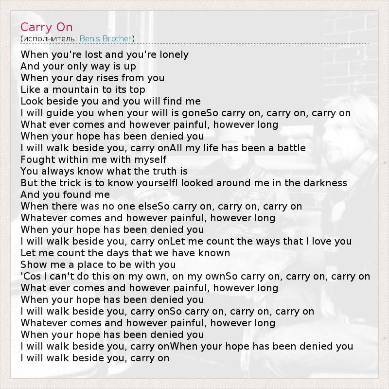 When you're lost and you're lonely And your only way is up When your day rises from you Like a mountain to its top Look beside you and you will find me I will guide you when your will is goneSo carry on, carry on, carry on What ever comes and however painful, however long When your hope has been denied you I will walk beside you, carry onAll my life has been a battle Fought within me with myself You always know what the truth is But the trick is to know yourselfI looked around me in the darkness And you found me When there was no one elseSo carry on, carry on, carry on Whatever comes and however painful, however long When your hope has been denied you I will walk beside you, carry onLet me count the ways that I love you Let me count the days that we have known Show me a place to be with you 'Cos I can't do this on my own, on my ownSo carry on, carry on, carry on What ever comes and however painful, however long When your hope has been denied you I will walk beside you, carry onSo carry on, carry on, carry on Whatever comes and however painful, however long When your hope has been denied you I will walk beside you, carry onWhen your hope has been denied you I will walk beside you, carry on