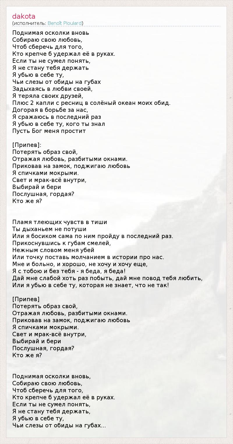 Поднимая осколки вновь Собираю свою любовь, Чтоб сберечь для того, Кто крепче б удержал её в руках. Если ты не сумел понять, Я не стану тебя держать Я убью в себе ту, Чьи слезы от обиды на губах Задыхаясь в любви своей, Я теряла своих друзей, Плюс 2 капли с ресниц в солёный океан моих обид. Догорая в борьбе за нас, Я сражаюсь в последний раз Я убью в себе ту, кого ты знал Пусть Бог меня простит [Припев]: Потерять образ свой, Отражая любовь, разбитыми окнами. Приковав на замок, поджигаю любовь Я спичками мокрыми. Свет и мрак-всё внутри, Выбирай и бери Послушная, гордая? Кто же я? Пламя тлеющих чувств в тиши Ты дыханьем не потуши Или я босиком сама по ним пройду в последний раз. Прикоснувшись к губам смелей, Нежным словом меня убей Или точку поставь молчанием в истории про нас. Мне и больно, и хорошо, не хочу и хочу еще, Я с тобою и без тебя - я беда, я беда! Дай мне слабой хоть раз побыть, дай мне повод тебя любить, Или я убью в себе ту, которая не знает, что не так! [Припев] Потерять образ свой, Отражая любовь, разбитыми окнами. Приковав на замок, поджигаю любовь Я спичками мокрыми. Свет и мрак-всё внутри, Выбирай и бери Послушная, гордая? Кто же я? Поднимая осколки вновь, Собираю свою любовь, Чтоб сберечь для того, Кто крепче б удержал её в руках. Если ты не сумел понять, Я не стану тебя держать, Я убью в себе ту, Чьи слезы от обиды на губах...