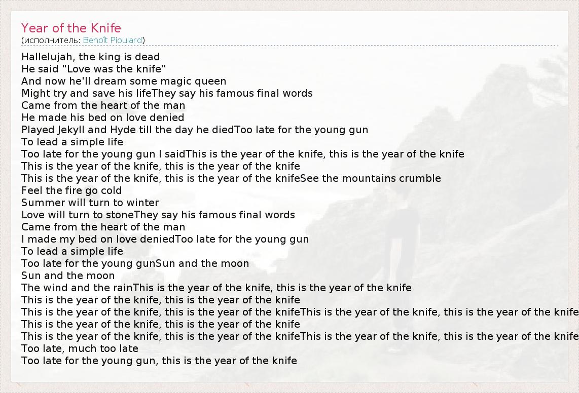 Hallelujah, the king is dead He said "Love was the knife" And now he'll dream some magic queen Might try and save his lifeThey say his famous final words Came from the heart of the man He made his bed on love denied Played Jekyll and Hyde till the day he diedToo late for the young gun To lead a simple life Too late for the young gun I saidThis is the year of the knife, this is the year of the knife This is the year of the knife, this is the year of the knife This is the year of the knife, this is the year of the knifeSee the mountains crumble Feel the fire go cold Summer will turn to winter Love will turn to stoneThey say his famous final words Came from the heart of the man I made my bed on love deniedToo late for the young gun To lead a simple life Too late for the young gunSun and the moon Sun and the moon The wind and the rainThis is the year of the knife, this is the year of the knife This is the year of the knife, this is the year of the knife This is the year of the knife, this is the year of the knifeThis is the year of the knife, this is the year of the knife This is the year of the knife, this is the year of the knife This is the year of the knife, this is the year of the knifeThis is the year of the knife, this is the year of the knife Too late, much too late Too late for the young gun, this is the year of the knife