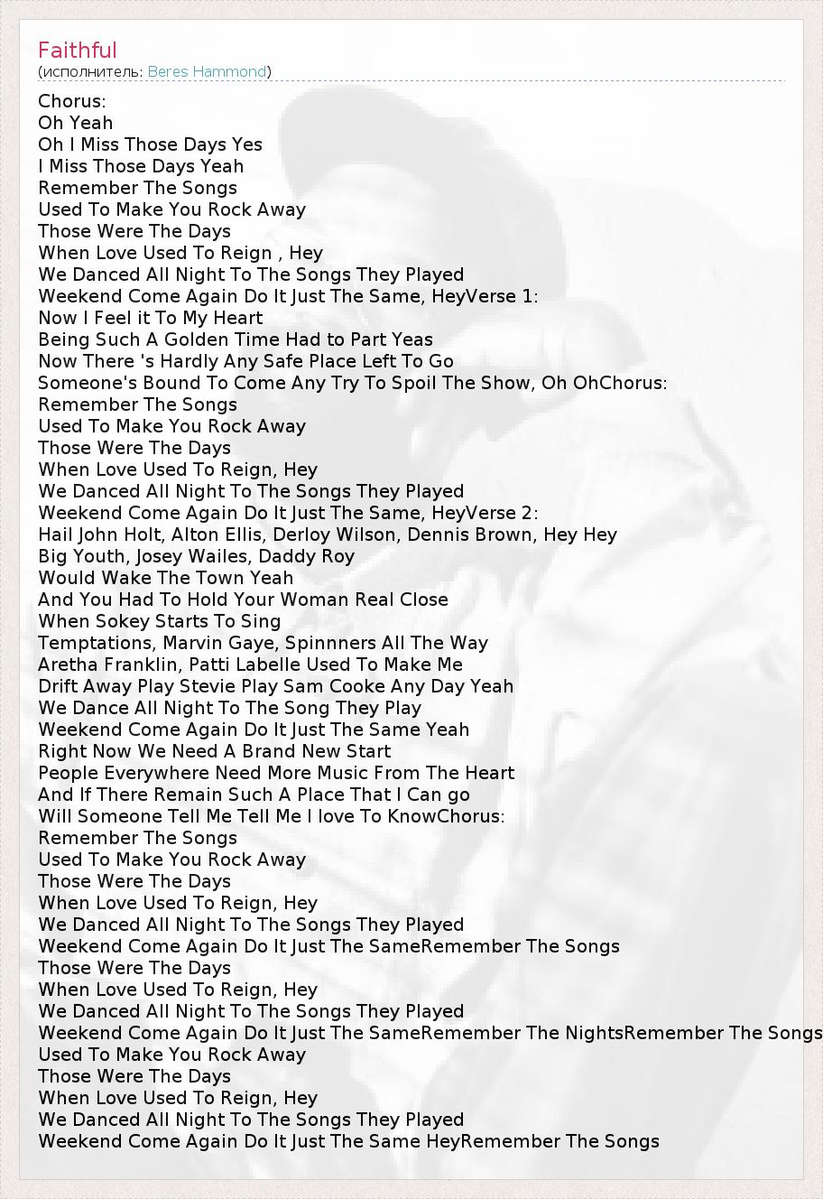 Chorus: Oh Yeah Oh I Miss Those Days Yes I Miss Those Days Yeah Remember The Songs Used To Make You Rock Away Those Were The Days When Love Used To Reign , Hey We Danced All Night To The Songs They Played Weekend Come Again Do It Just The Same, HeyVerse 1: Now I Feel it To My Heart Being Such A Golden Time Had to Part Yeas Now There 's Hardly Any Safe Place Left To Go Someone's Bound To Come Any Try To Spoil The Show, Oh OhChorus: Remember The Songs Used To Make You Rock Away Those Were The Days When Love Used To Reign, Hey We Danced All Night To The Songs They Played Weekend Come Again Do It Just The Same, HeyVerse 2: Hail John Holt, Alton Ellis, Derloy Wilson, Dennis Brown, Hey Hey Big Youth, Josey Wailes, Daddy Roy Would Wake The Town Yeah And You Had To Hold Your Woman Real Close When Sokey Starts To Sing Temptations, Marvin Gaye, Spinnners All The Way Aretha Franklin, Patti Labelle Used To Make Me Drift Away Play Stevie Play Sam Cooke Any Day Yeah We Dance All Night To The Song They Play Weekend Come Again Do It Just The Same Yeah Right Now We Need A Brand New Start People Everywhere Need More Music From The Heart And If There Remain Such A Place That I Can go Will Someone Tell Me Tell Me I love To KnowChorus: Remember The Songs Used To Make You Rock Away Those Were The Days When Love Used To Reign, Hey We Danced All Night To The Songs They Played Weekend Come Again Do It Just The SameRemember The Songs Those Were The Days When Love Used To Reign, Hey We Danced All Night To The Songs They Played Weekend Come Again Do It Just The SameRemember The NightsRemember The Songs Used To Make You Rock Away Those Were The Days When Love Used To Reign, Hey We Danced All Night To The Songs They Played Weekend Come Again Do It Just The Same HeyRemember The Songs