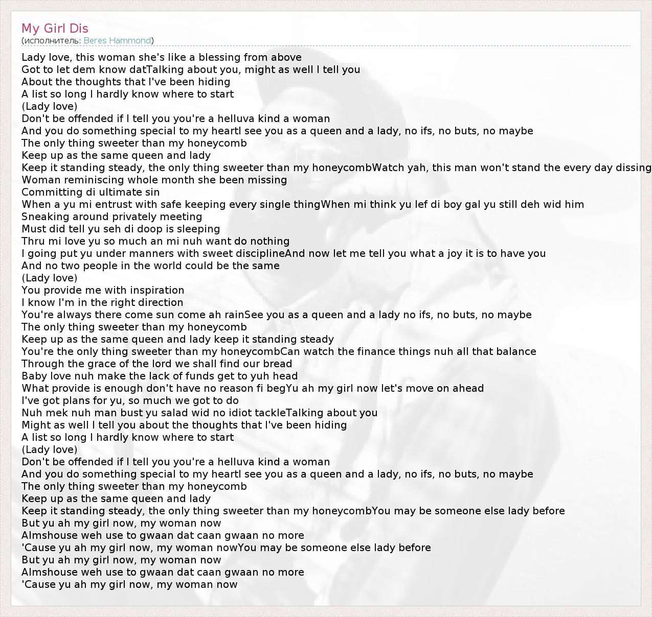 Lady love, this woman she's like a blessing from above Got to let dem know datTalking about you, might as well I tell you About the thoughts that I've been hiding A list so long I hardly know where to start (Lady love) Don't be offended if I tell you you're a helluva kind a woman And you do something special to my heartI see you as a queen and a lady, no ifs, no buts, no maybe The only thing sweeter than my honeycomb Keep up as the same queen and lady Keep it standing steady, the only thing sweeter than my honeycombWatch yah, this man won't stand the every day dissing Woman reminiscing whole month she been missing Committing di ultimate sin When a yu mi entrust with safe keeping every single thingWhen mi think yu lef di boy gal yu still deh wid him Sneaking around privately meeting Must did tell yu seh di doop is sleeping Thru mi love yu so much an mi nuh want do nothing I going put yu under manners with sweet disciplineAnd now let me tell you what a joy it is to have you And no two people in the world could be the same (Lady love) You provide me with inspiration I know I'm in the right direction You're always there come sun come ah rainSee you as a queen and a lady no ifs, no buts, no maybe The only thing sweeter than my honeycomb Keep up as the same queen and lady keep it standing steady You're the only thing sweeter than my honeycombCan watch the finance things nuh all that balance Through the grace of the lord we shall find our bread Baby love nuh make the lack of funds get to yuh head What provide is enough don't have no reason fi begYu ah my girl now let's move on ahead I've got plans for yu, so much we got to do Nuh mek nuh man bust yu salad wid no idiot tackleTalking about you Might as well I tell you about the thoughts that I've been hiding A list so long I hardly know where to start (Lady love) Don't be offended if I tell you you're a helluva kind a woman And you do something special to my heartI see you as a queen and a lady, no ifs, no buts, no maybe The only thing sweeter than my honeycomb Keep up as the same queen and lady Keep it standing steady, the only thing sweeter than my honeycombYou may be someone else lady before But yu ah my girl now, my woman now Almshouse weh use to gwaan dat caan gwaan no more 'Cause yu ah my girl now, my woman nowYou may be someone else lady before But yu ah my girl now, my woman now Almshouse weh use to gwaan dat caan gwaan no more 'Cause yu ah my girl now, my woman now