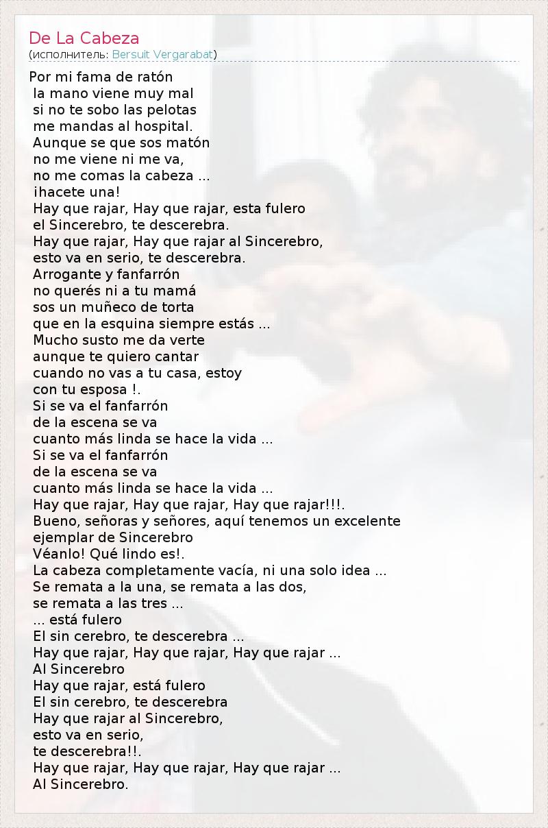 Пор-де-ми Fama Ратон ла Мано Viene Muy мал не си не те SoBo лас Pelotas мне мандал аль больницу. Aunque себе Que SOS Maton нет мне Viene Ni меня ва, нет мне комы ла Кабеса ... ¡Hacete уна! Сено Que Раджар Хэй Que Раджар, ЭСТА fulero эль Sincerebro, т.е descerebra. Сено Que Раджар Хэй Que Раджар аль Sincerebro, Эсто ва ан-Серио, т.е descerebra. Arrogante у fanfarrón нет querés Н.И. Mamá tử SOS ООН muñeco де торта Que ла Эскина ан Siempre Estas ... Mucho susto мне да Verte aunque те Quiero Cantar не Cuando нет VAS Ту-Каса, Estoy кон вт esposa!. Si себе ва-эль fanfarrón де-ла-escena себе ва Cuanto más Линда себе HACE La Vida ... Si себе ва-эль fanfarrón де-ла-escena себе ва Cuanto más Линда себе HACE La Vida ... Сено Que Раджар Хэй Que Раджар Хэй Que Раджар !!!. Буэно, señoras у señores, aquí Буш начал ООН Excelente ejemplar де Sincerebro Véanlo! Qué Линдо эс !. Ла Кабеза Completamente vacía, Ni Una соло идея ... Се ля Remata уна, SE Remata Лас-дус, SE Remata Лас Tres ... ... Está fulero Эль грех спинно, т.е descerebra ... Сено Que Раджар Хэй Que Раджар Хэй Que Раджар ... Аль Sincerebro Сено Que Раджар, ЭСТА fulero Эль грех спинно, т.е descerebra Сено Que Раджар аль Sincerebro, Эсто ва ан-Серио, те descerebra !!. Сено Que Раджар Хэй Que Раджар Хэй Que Раджар ... Аль Sincerebro.