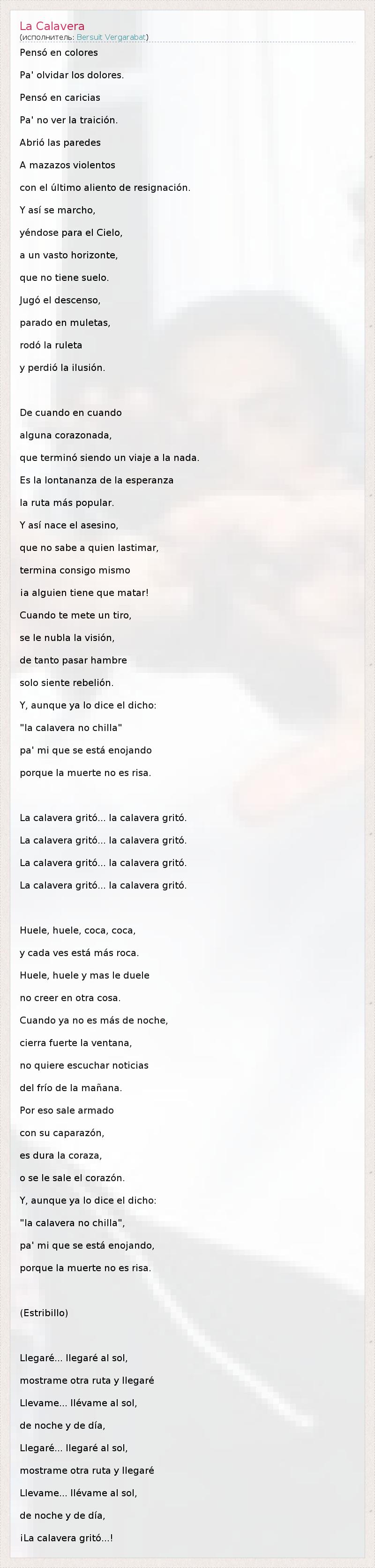 Pensó en colores Pa' olvidar los dolores. Pensó en caricias Pa' no ver la traición. Abrió las paredes A mazazos violentos con el último aliento de resignación. Y así se marcho, yéndose para el Cielo, a un vasto horizonte, que no tiene suelo. Jugó el descenso, parado en muletas, rodó la ruleta y perdió la ilusión. De cuando en cuando alguna corazonada, que terminó siendo un viaje a la nada. Es la lontananza de la esperanza la ruta más popular. Y así nace el asesino, que no sabe a quien lastimar, termina consigo mismo ¡a alguien tiene que matar! Cuando te mete un tiro, se le nubla la visión, de tanto pasar hambre solo siente rebelión. Y, aunque ya lo dice el dicho: "la calavera no chilla" pa' mi que se está enojando porque la muerte no es risa. La calavera gritó... la calavera gritó. La calavera gritó... la calavera gritó. La calavera gritó... la calavera gritó. La calavera gritó... la calavera gritó. Huele, huele, coca, coca, y cada ves está más roca. Huele, huele y mas le duele no creer en otra cosa. Cuando ya no es más de noche, cierra fuerte la ventana, no quiere escuchar noticias del frío de la mañana. Por eso sale armado con su caparazón, es dura la coraza, o se le sale el corazón. Y, aunque ya lo dice el dicho: "la calavera no chilla", pa' mi que se está enojando, porque la muerte no es risa. (Estribillo) Llegaré... llegaré al sol, mostrame otra ruta y llegaré Llevame... llévame al sol, de noche y de día, Llegaré... llegaré al sol, mostrame otra ruta y llegaré Llevame... llévame al sol, de noche y de día, ¡La calavera gritó...!