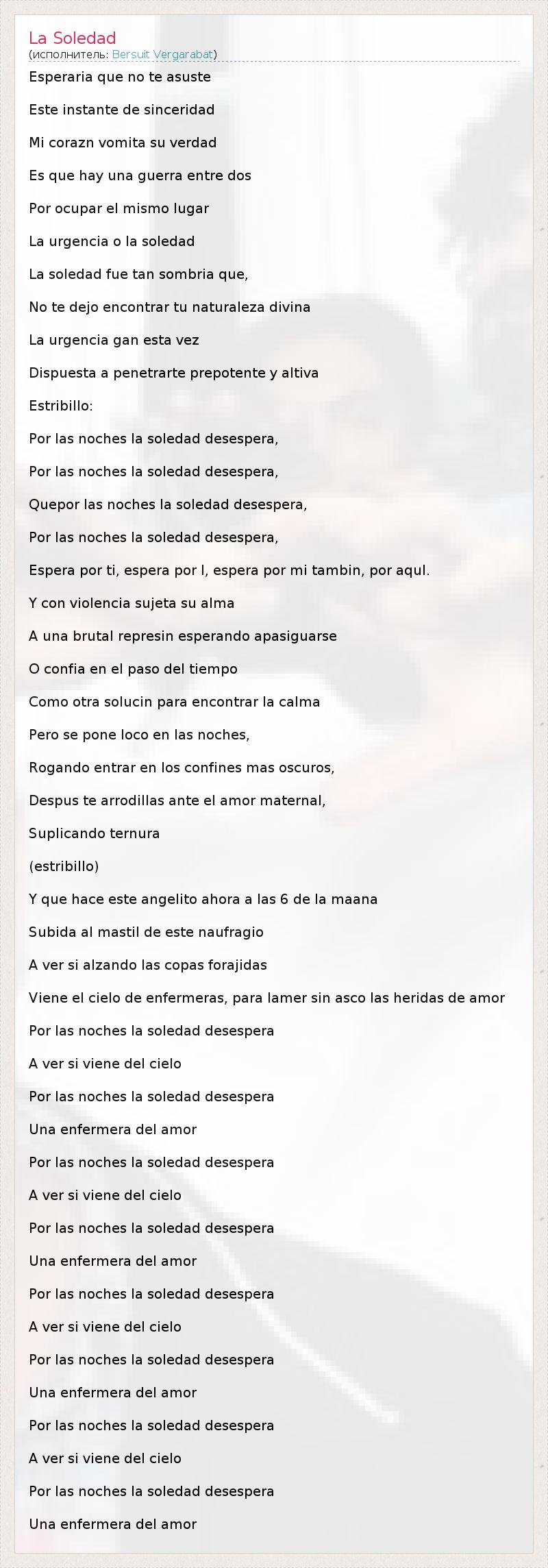 Esperaria que no te asuste Este instante de sinceridad Mi corazn vomita su verdad Es que hay una guerra entre dos Por ocupar el mismo lugar La urgencia o la soledad La soledad fue tan sombria que, No te dejo encontrar tu naturaleza divina La urgencia gan esta vez Dispuesta a penetrarte prepotente y altiva Estribillo: Por las noches la soledad desespera, Por las noches la soledad desespera, Quepor las noches la soledad desespera, Por las noches la soledad desespera, Espera por ti, espera por l, espera por mi tambin, por aqul. Y con violencia sujeta su alma A una brutal represin esperando apasiguarse O confia en el paso del tiempo Como otra solucin para encontrar la calma Pero se pone loco en las noches, Rogando entrar en los confines mas oscuros, Despus te arrodillas ante el amor maternal, Suplicando ternura (estribillo) Y que hace este angelito ahora a las 6 de la maana Subida al mastil de este naufragio A ver si alzando las copas forajidas Viene el cielo de enfermeras, para lamer sin asco las heridas de amor Por las noches la soledad desespera A ver si viene del cielo Por las noches la soledad desespera Una enfermera del amor Por las noches la soledad desespera A ver si viene del cielo Por las noches la soledad desespera Una enfermera del amor Por las noches la soledad desespera A ver si viene del cielo Por las noches la soledad desespera Una enfermera del amor Por las noches la soledad desespera A ver si viene del cielo Por las noches la soledad desespera Una enfermera del amor