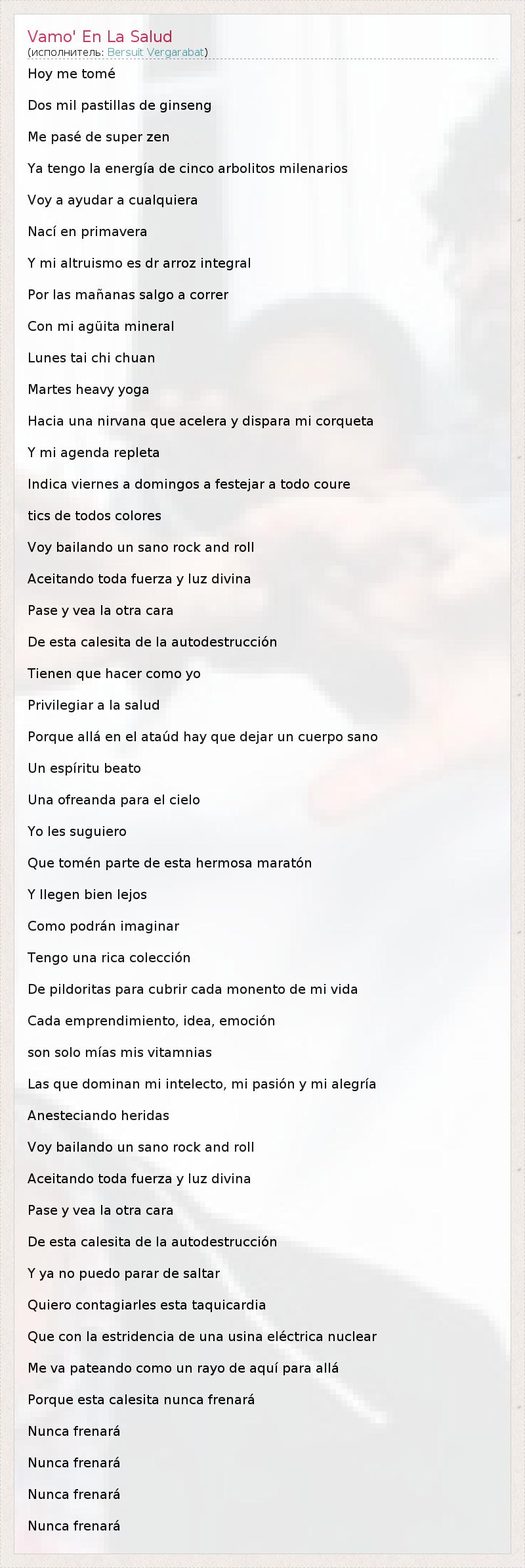 Это интересно:Bersuit Vergarabat, сформировались в 1989 в Аргентине и являются одними из наиболее известных исполнителей латинского рока 90-х.После 2 х андеграундовых альбомов, группа стала смешивать рок с латиноамериканскими ритмами такими как кумбиа(колумбийский народный танец), чакарера(испанский танец), кандомбе(негритянский танец под барабаны) и куртетанзо(тоже латинский... продолжение