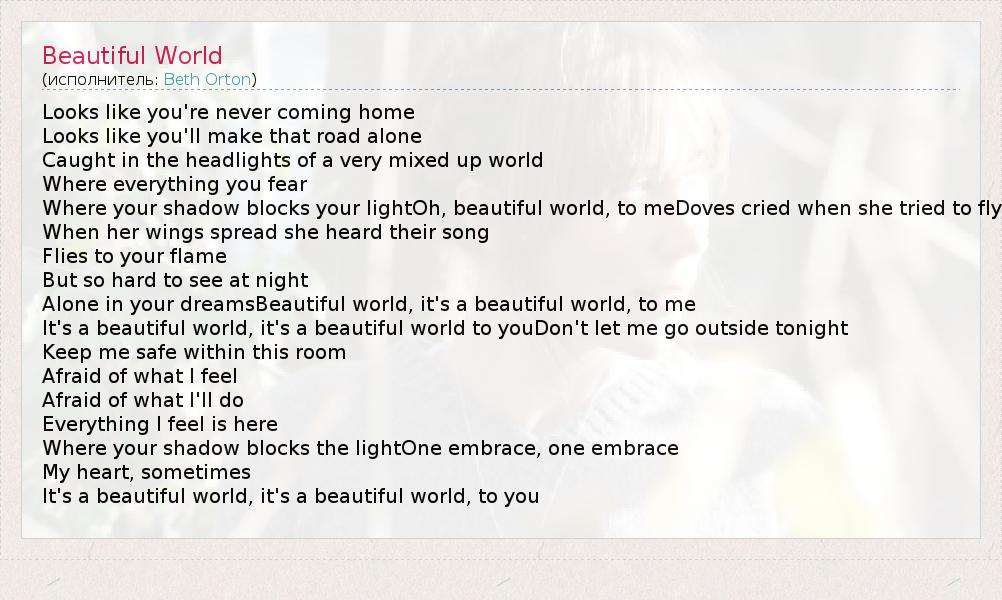 Looks like you're never coming home Looks like you'll make that road alone Caught in the headlights of a very mixed up world Where everything you fear Where your shadow blocks your lightOh, beautiful world, to meDoves cried when she tried to fly When her wings spread she heard their song Flies to your flame But so hard to see at night Alone in your dreamsBeautiful world, it's a beautiful world, to me It's a beautiful world, it's a beautiful world to youDon't let me go outside tonight Keep me safe within this room Afraid of what I feel Afraid of what I'll do Everything I feel is here Where your shadow blocks the lightOne embrace, one embrace My heart, sometimes It's a beautiful world, it's a beautiful world, to you