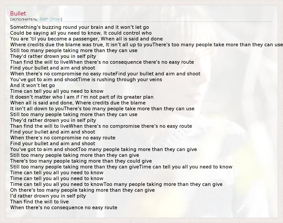 Something's buzzing round your brain and it won't let go Could be saying all you need to know, It could control who You are 'til you become a passenger, When all is said and done Where credits due the blame was true, It isn't all up to youThere's too many people take more than they can use Still too many people taking more than they can use They'd rather drown you in self pity Than find the will to liveWhen there's no consequence there's no easy route Find your bullet and aim and shoot When there's no compromise no easy routeFind your bullet and aim and shoot You've got to aim and shootTime is rushing through your veins And it won't let go Time can tell you all you need to know It doesn't matter who I am if I'm not part of its greater plan When all is said and done, Where credits due the blame It isn't all down to youThere's too many people take more than they can use Still too many people taking more than they can use They'd rather drown you in self pity Than find the will to liveWhen there's no compromise there's no easy route Find your bullet and aim and shoot When there's no compromise no easy route Find your bullet and aim and shoot You've got to aim and shootToo many people taking more than they can give Still too many people taking more than they can give There's too many people taking more than they could give Still too many people taking more than they can giveTime can tell you all you need to know Time can tell you all you need to know Time can tell you all you need to know Time can tell you all you need to knowToo many people taking more than they can give Oh there's too many people taking more than they can give I'd rather drown you in self pity Than find the will to live When there's no consequence no easy route