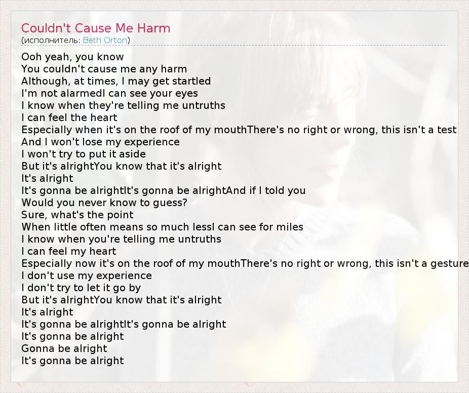 А как ты думаешь, о чем песня "Couldn't Cause Me Harm" ?