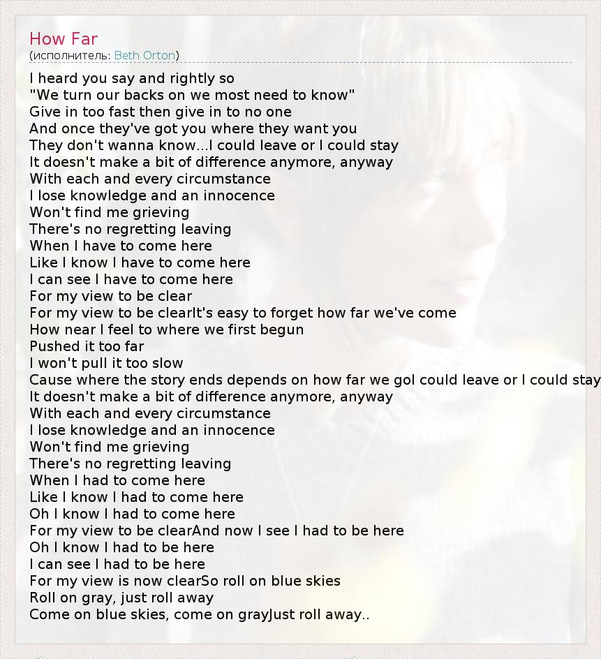 I heard you say and rightly so "We turn our backs on we most need to know" Give in too fast then give in to no one And once they've got you where they want you They don't wanna know...I could leave or I could stay It doesn't make a bit of difference anymore, anyway With each and every circumstance I lose knowledge and an innocence Won't find me grieving There's no regretting leaving When I have to come here Like I know I have to come here I can see I have to come here For my view to be clear For my view to be clearIt's easy to forget how far we've come How near I feel to where we first begun Pushed it too far I won't pull it too slow Cause where the story ends depends on how far we goI could leave or I could stay It doesn't make a bit of difference anymore, anyway With each and every circumstance I lose knowledge and an innocence Won't find me grieving There's no regretting leaving When I had to come here Like I know I had to come here Oh I know I had to come here For my view to be clearAnd now I see I had to be here Oh I know I had to be here I can see I had to be here For my view is now clearSo roll on blue skies Roll on gray, just roll away Come on blue skies, come on grayJust roll away..
