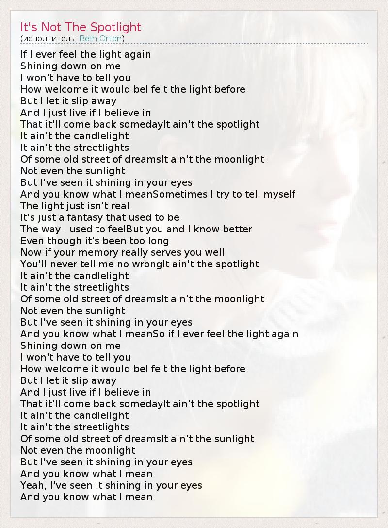 If I ever feel the light again Shining down on me I won't have to tell you How welcome it would beI felt the light before But I let it slip away And I just live if I believe in That it'll come back somedayIt ain't the spotlight It ain't the candlelight It ain't the streetlights Of some old street of dreamsIt ain't the moonlight Not even the sunlight But I've seen it shining in your eyes And you know what I meanSometimes I try to tell myself The light just isn't real It's just a fantasy that used to be The way I used to feelBut you and I know better Even though it's been too long Now if your memory really serves you well You'll never tell me no wrongIt ain't the spotlight It ain't the candlelight It ain't the streetlights Of some old street of dreamsIt ain't the moonlight Not even the sunlight But I've seen it shining in your eyes And you know what I meanSo if I ever feel the light again Shining down on me I won't have to tell you How welcome it would beI felt the light before But I let it slip away And I just live if I believe in That it'll come back somedayIt ain't the spotlight It ain't the candlelight It ain't the streetlights Of some old street of dreamsIt ain't the sunlight Not even the moonlight But I've seen it shining in your eyes And you know what I mean Yeah, I've seen it shining in your eyes And you know what I mean