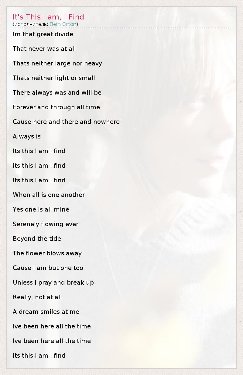 Im that great divide That never was at all Thats neither large nor heavy Thats neither light or small There always was and will be Forever and through all time Cause here and there and nowhere Always is Its this I am I find Its this I am I find Its this I am I find When all is one another Yes one is all mine Serenely flowing ever Beyond the tide The flower blows away Cause I am but one too Unless I pray and break up Really, not at all A dream smiles at me Ive been here all the time Ive been here all the time Its this I am I find