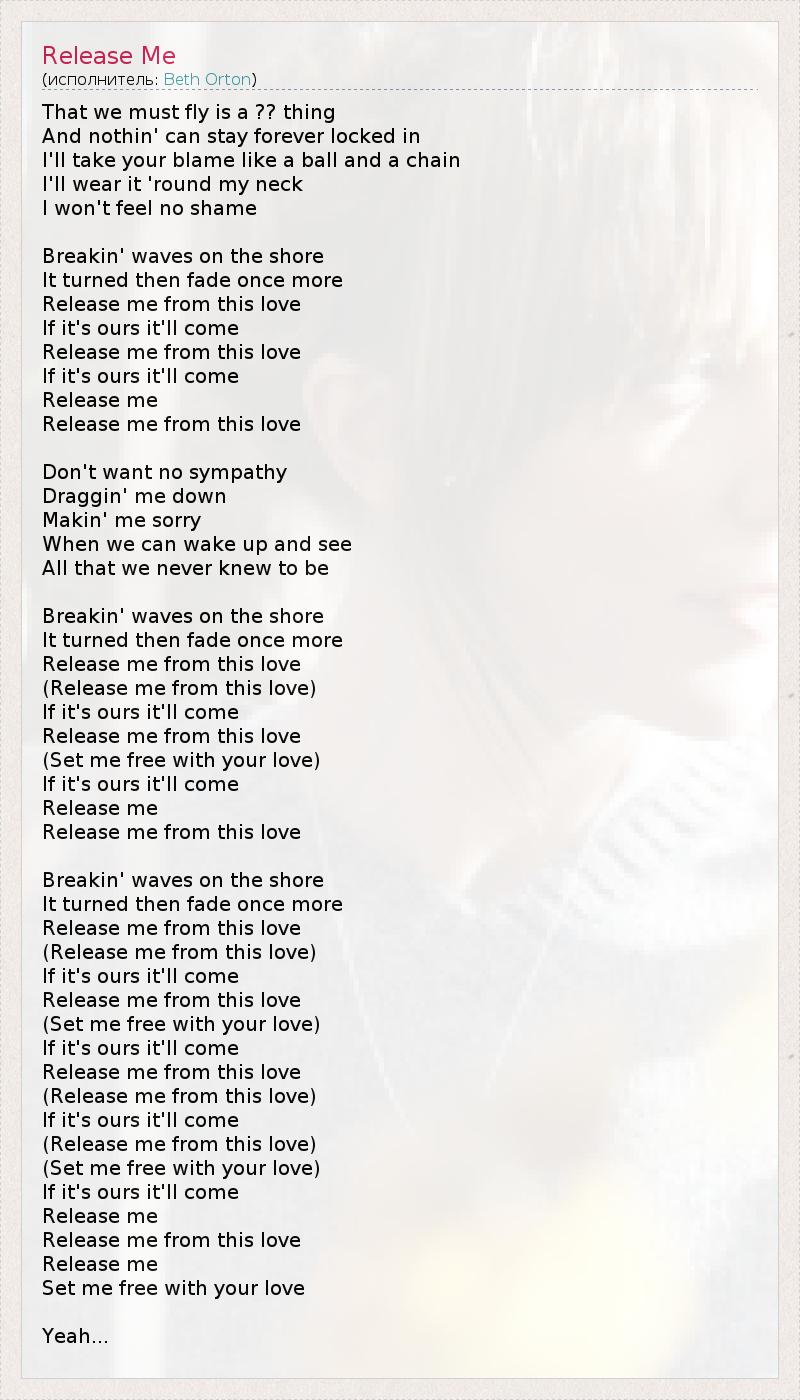That we must fly is a ?? thing And nothin' can stay forever locked in I'll take your blame like a ball and a chain I'll wear it 'round my neck I won't feel no shame Breakin' waves on the shore It turned then fade once more Release me from this love If it's ours it'll come Release me from this love If it's ours it'll come Release me Release me from this love Don't want no sympathy Draggin' me down Makin' me sorry When we can wake up and see All that we never knew to be Breakin' waves on the shore It turned then fade once more Release me from this love (Release me from this love) If it's ours it'll come Release me from this love (Set me free with your love) If it's ours it'll come Release me Release me from this love Breakin' waves on the shore It turned then fade once more Release me from this love (Release me from this love) If it's ours it'll come Release me from this love (Set me free with your love) If it's ours it'll come Release me from this love (Release me from this love) If it's ours it'll come (Release me from this love) (Set me free with your love) If it's ours it'll come Release me Release me from this love Release me Set me free with your love Yeah...