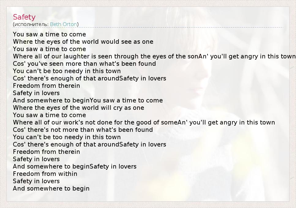 You saw a time to come Where the eyes of the world would see as one You saw a time to come Where all of our laughter is seen through the eyes of the sonAn' you'll get angry in this town Cos' you've seen more than what's been found You can't be too needy in this town Cos' there's enough of that aroundSafety in lovers Freedom from therein Safety in lovers And somewhere to beginYou saw a time to come Where the eyes of the world will cry as one You saw a time to come Where all of our work's not done for the good of someAn' you'll get angry in this town Cos' there's not more than what's been found You can't be too needy in this town Cos' there's enough of that aroundSafety in lovers Freedom from therein Safety in lovers And somewhere to beginSafety in lovers Freedom from within Safety in lovers And somewhere to begin