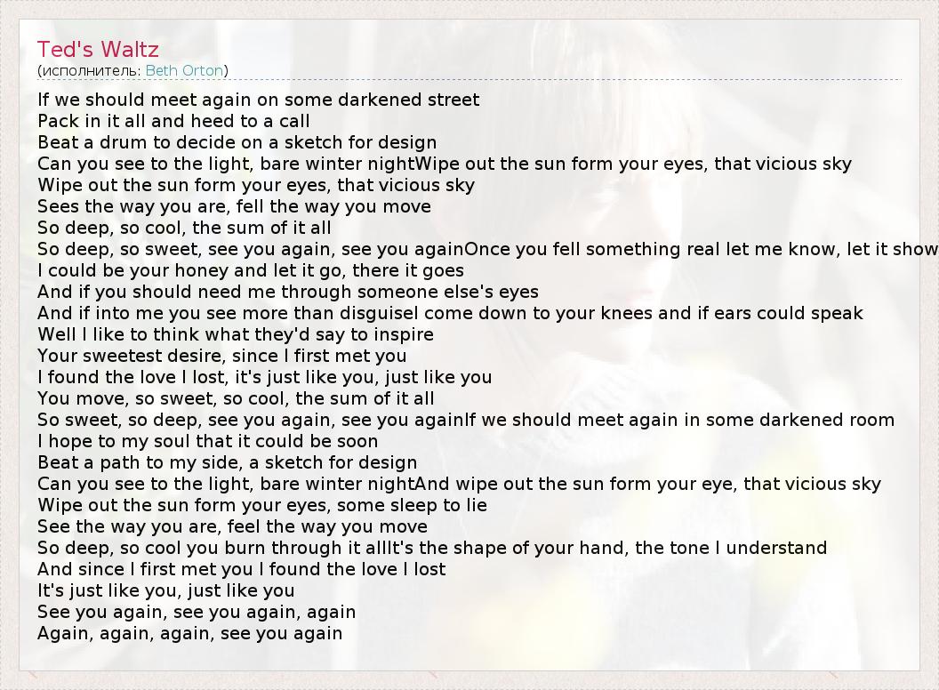 So sweet, so deep, see you again, see you againIf we should meet again in some darkened room