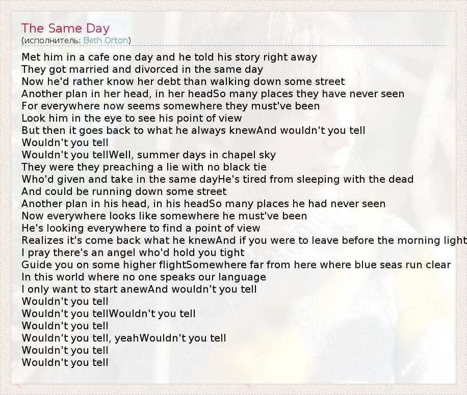 Met him in a cafe one day and he told his story right away They got married and divorced in the same day Now he'd rather know her debt than walking down some street Another plan in her head, in her headSo many places they have never seen For everywhere now seems somewhere they must've been Look him in the eye to see his point of view But then it goes back to what he always knewAnd wouldn't you tell Wouldn't you tell Wouldn't you tellWell, summer days in chapel sky They were they preaching a lie with no black tie Who'd given and take in the same dayHe's tired from sleeping with the dead And could be running down some street Another plan in his head, in his headSo many places he had never seen Now everywhere looks like somewhere he must've been He's looking everywhere to find a point of view Realizes it's come back what he knewAnd if you were to leave before the morning light I pray there's an angel who'd hold you tight Guide you on some higher flightSomewhere far from here where blue seas run clear In this world where no one speaks our language I only want to start anewAnd wouldn't you tell Wouldn't you tell Wouldn't you tellWouldn't you tell Wouldn't you tell Wouldn't you tell, yeahWouldn't you tell Wouldn't you tell Wouldn't you tell