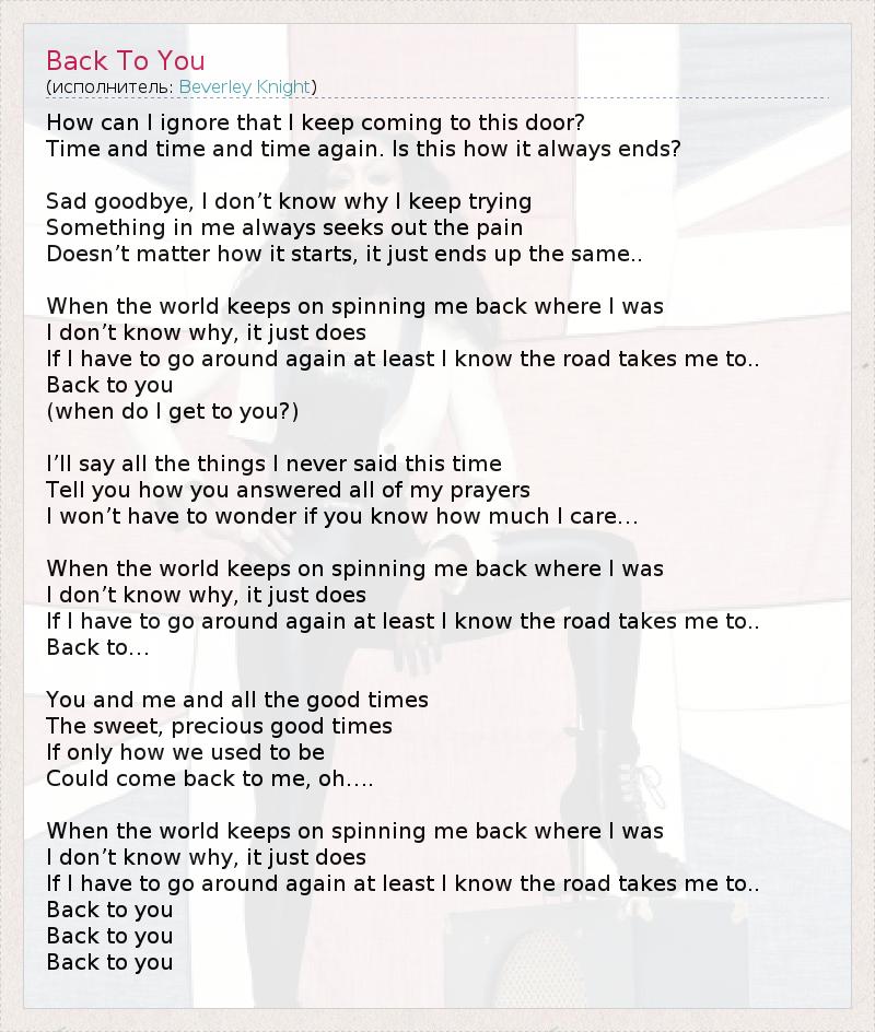 How can I ignore that I keep coming to this door? Time and time and time again. Is this how it always ends? Sad goodbye, I don’t know why I keep trying Something in me always seeks out the pain Doesn’t matter how it starts, it just ends up the same.. When the world keeps on spinning me back where I was I don’t know why, it just does If I have to go around again at least I know the road takes me to.. Back to you (when do I get to you?) I’ll say all the things I never said this time Tell you how you answered all of my prayers I won’t have to wonder if you know how much I care… When the world keeps on spinning me back where I was I don’t know why, it just does If I have to go around again at least I know the road takes me to.. Back to… You and me and all the good times The sweet, precious good times If only how we used to be Could come back to me, oh…. When the world keeps on spinning me back where I was I don’t know why, it just does If I have to go around again at least I know the road takes me to.. Back to you Back to you Back to you