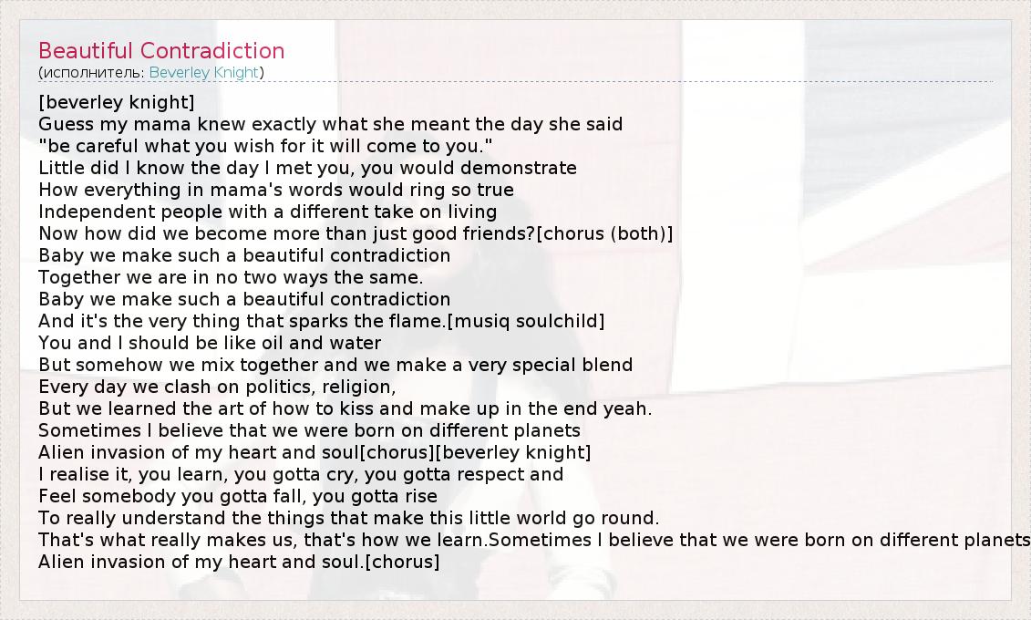 [beverley knight] Guess my mama knew exactly what she meant the day she said "be careful what you wish for it will come to you." Little did I know the day I met you, you would demonstrate How everything in mama's words would ring so true Independent people with a different take on living Now how did we become more than just good friends?[chorus (both)] Baby we make such a beautiful contradiction Together we are in no two ways the same. Baby we make such a beautiful contradiction And it's the very thing that sparks the flame.[musiq soulchild] You and I should be like oil and water But somehow we mix together and we make a very special blend Every day we clash on politics, religion, But we learned the art of how to kiss and make up in the end yeah. Sometimes I believe that we were born on different planets Alien invasion of my heart and soul[chorus][beverley knight] I realise it, you learn, you gotta cry, you gotta respect and Feel somebody you gotta fall, you gotta rise To really understand the things that make this little world go round. That's what really makes us, that's how we learn.Sometimes I believe that we were born on different planets Alien invasion of my heart and soul.[chorus]