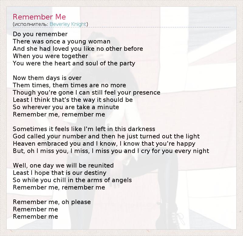 Do you remember There was once a young woman And she had loved you like no other before When you were together You were the heart and soul of the party Now them days is over Them times, them times are no more Though you're gone I can still feel your presence Least I think that's the way it should be So wherever you are take a minute Remember me, remember me Sometimes it feels like I'm left in this darkness God called your number and then he just turned out the light Heaven embraced you and I know, I know that you're happy But, oh I miss you, I miss, I miss you and I cry for you every night Well, one day we will be reunited Least I hope that is our destiny So while you chill in the arms of angels Remember me, remember me Remember me, oh please Remember me Remember me