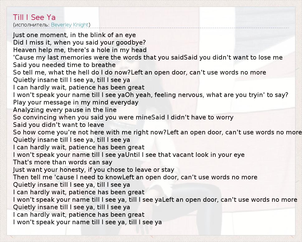 Just one moment, in the blink of an eye Did I miss it, when you said your goodbye? Heaven help me, there's a hole in my head 'Cause my last memories were the words that you saidSaid you didn't want to lose me Said you needed time to breathe So tell me, what the hell do I do now?Left an open door, can't use words no more Quietly insane till I see ya, till I see ya I can hardly wait, patience has been great I won't speak your name till I see yaOh yeah, feeling nervous, what are you tryin' to say? Play your message in my mind everyday Analyzing every pause in the line So convincing when you said you were mineSaid I didn't have to worry Said you didn't want to leave So how come you're not here with me right now?Left an open door, can't use words no more Quietly insane till I see ya, till I see ya I can hardly wait, patience has been great I won't speak your name till I see yaUntil I see that vacant look in your eye That's more than words can say Just want your honesty, if you chose to leave or stay Then tell me 'cause I need to knowLeft an open door, can't use words no more Quietly insane till I see ya, till I see ya I can hardly wait, patience has been great I won't speak your name till I see ya, till I see yaLeft an open door, can't use words no more Quietly insane till I see ya, till I see ya I can hardly wait, patience has been great I won't speak your name till I see ya, till I see ya