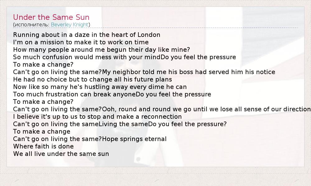 Running about in a daze in the heart of London I'm on a mission to make it to work on time How many people around me begun their day like mine? So much confusion would mess with your mindDo you feel the pressure To make a change? Can't go on living the same?My neighbor told me his boss had served him his notice He had no choice but to change all his future plans Now like so many he's hustling away every dime he can Too much frustration can break anyoneDo you feel the pressure To make a change? Can't go on living the same?Ooh, round and round we go until we lose all sense of our direction I believe it's up to us to stop and make a reconnection Can't go on living the sameLiving the sameDo you feel the pressure? To make a change Can't go on living the same?Hope springs eternal Where faith is done We all live under the same sun