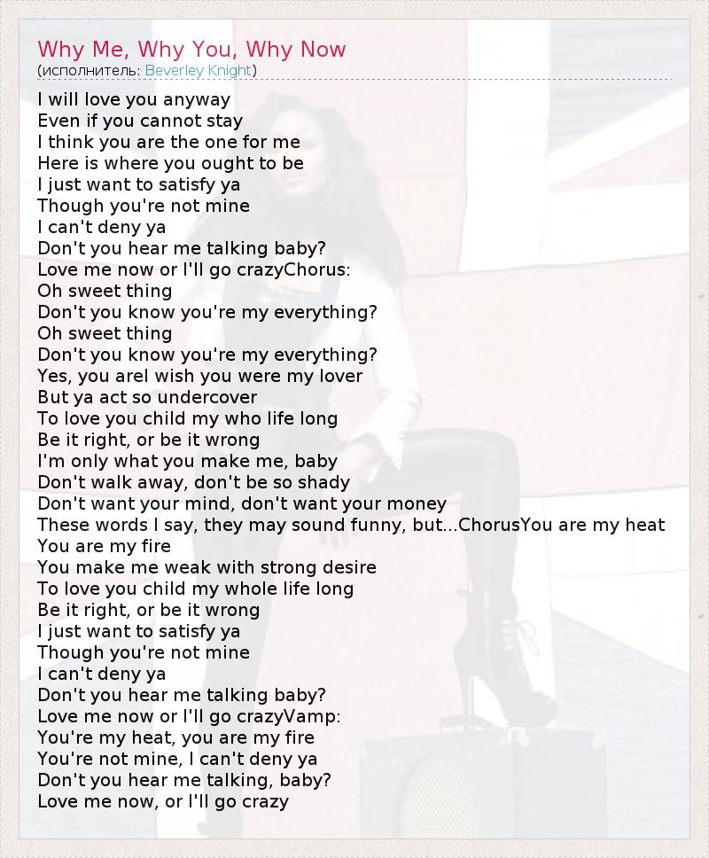 А как ты думаешь, о чем песня "Why Me, Why You, Why Now" ?