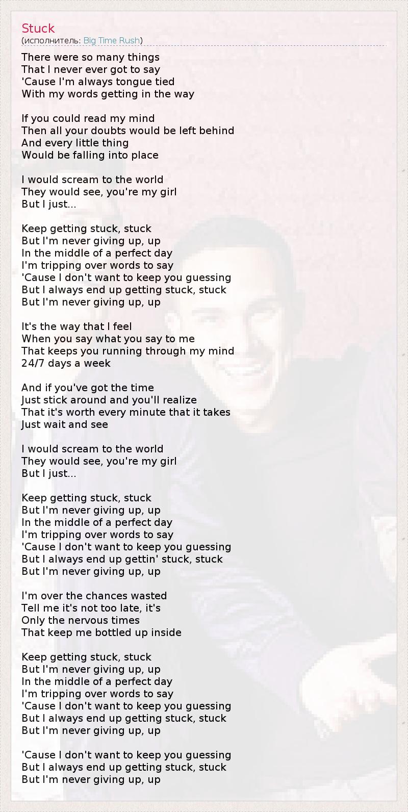 There were so many things That I never ever got to say 'Cause I'm always tongue tied With my words getting in the way If you could read my mind Then all your doubts would be left behind And every little thing Would be falling into place I would scream to the world They would see, you're my girl But I just... Keep getting stuck, stuck But I'm never giving up, up In the middle of a perfect day I'm tripping over words to say 'Cause I don't want to keep you guessing But I always end up getting stuck, stuck But I'm never giving up, up It's the way that I feel When you say what you say to me That keeps you running through my mind 24/7 days a week And if you've got the time Just stick around and you'll realize That it's worth every minute that it takes Just wait and see I would scream to the world They would see, you're my girl But I just... Keep getting stuck, stuck But I'm never giving up, up In the middle of a perfect day I'm tripping over words to say 'Cause I don't want to keep you guessing But I always end up gettin' stuck, stuck But I'm never giving up, up I'm over the chances wasted Tell me it's not too late, it's Only the nervous times That keep me bottled up inside Keep getting stuck, stuck But I'm never giving up, up In the middle of a perfect day I'm tripping over words to say 'Cause I don't want to keep you guessing But I always end up getting stuck, stuck But I'm never giving up, up 'Cause I don't want to keep you guessing But I always end up getting stuck, stuck But I'm never giving up, up
