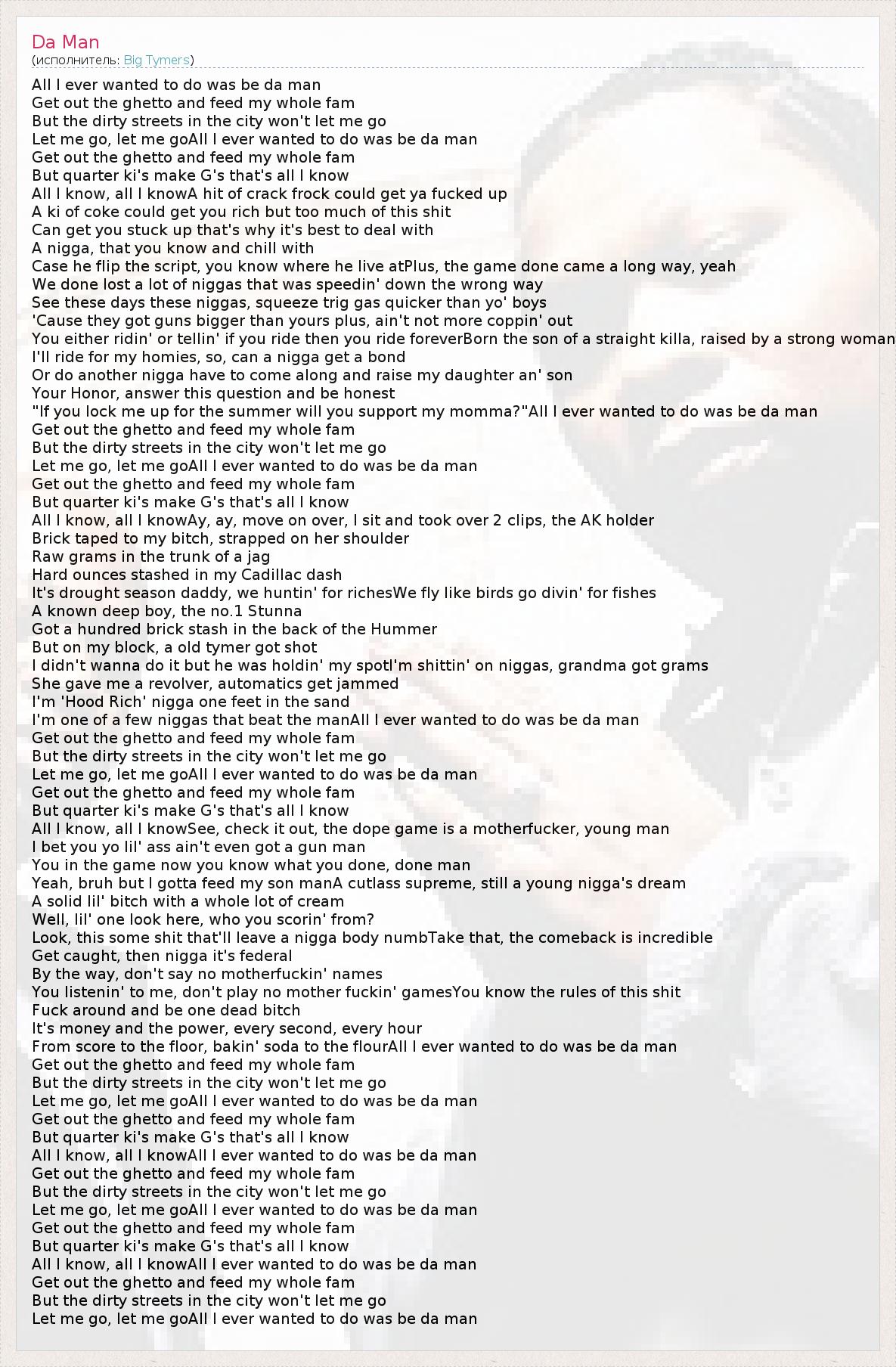 All I ever wanted to do was be da man Get out the ghetto and feed my whole fam But the dirty streets in the city won't let me go Let me go, let me goAll I ever wanted to do was be da man Get out the ghetto and feed my whole fam But quarter ki's make G's that's all I know All I know, all I knowA hit of crack frock could get ya fucked up A ki of coke could get you rich but too much of this shit Can get you stuck up that's why it's best to deal with A nigga, that you know and chill with Case he flip the script, you know where he live atPlus, the game done came a long way, yeah We done lost a lot of niggas that was speedin' down the wrong way See these days these niggas, squeeze trig gas quicker than yo' boys 'Cause they got guns bigger than yours plus, ain't not more coppin' out You either ridin' or tellin' if you ride then you ride foreverBorn the son of a straight killa, raised by a strong woman I'll ride for my homies, so, can a nigga get a bond Or do another nigga have to come along and raise my daughter an' son Your Honor, answer this question and be honest "If you lock me up for the summer will you support my momma?"All I ever wanted to do was be da man Get out the ghetto and feed my whole fam But the dirty streets in the city won't let me go Let me go, let me goAll I ever wanted to do was be da man Get out the ghetto and feed my whole fam But quarter ki's make G's that's all I know All I know, all I knowAy, ay, move on over, I sit and took over 2 clips, the AK holder Brick taped to my bitch, strapped on her shoulder Raw grams in the trunk of a jag Hard ounces stashed in my Cadillac dash It's drought season daddy, we huntin' for richesWe fly like birds go divin' for fishes A known deep boy, the no.1 Stunna Got a hundred brick stash in the back of the Hummer But on my block, a old tymer got shot I didn't wanna do it but he was holdin' my spotI'm shittin' on niggas, grandma got grams She gave me a revolver, automatics get jammed I'm 'Hood Rich' nigga one feet in the sand I'm one of a few niggas that beat the manAll I ever wanted to do was be da man Get out the ghetto and feed my whole fam But the dirty streets in the city won't let me go Let me go, let me goAll I ever wanted to do was be da man Get out the ghetto and feed my whole fam But quarter ki's make G's that's all I know All I know, all I knowSee, check it out, the dope game is a motherfucker, young man I bet you yo lil' ass ain't even got a gun man You in the game now you know what you done, done man Yeah, bruh but I gotta feed my son manA cutlass supreme, still a young nigga's dream A solid lil' bitch with a whole lot of cream Well, lil' one look here, who you scorin' from? Look, this some shit that'll leave a nigga body numbTake that, the comeback is incredible Get caught, then nigga it's federal By the way, don't say no motherfuckin' names You listenin' to me, don't play no mother fuckin' gamesYou know the rules of this shit Fuck around and be one dead bitch It's money and the power, every second, every hour From score to the floor, bakin' soda to the flourAll I ever wanted to do was be da man Get out the ghetto and feed my whole fam But the dirty streets in the city won't let me go Let me go, let me goAll I ever wanted to do was be da man Get out the ghetto and feed my whole fam But quarter ki's make G's that's all I know All I know, all I knowAll I ever wanted to do was be da man Get out the ghetto and feed my whole fam But the dirty streets in the city won't let me go Let me go, let me goAll I ever wanted to do was be da man Get out the ghetto and feed my whole fam But quarter ki's make G's that's all I know All I know, all I knowAll I ever wanted to do was be da man Get out the ghetto and feed my whole fam But the dirty streets in the city won't let me go Let me go, let me goAll I ever wanted to do was be da man