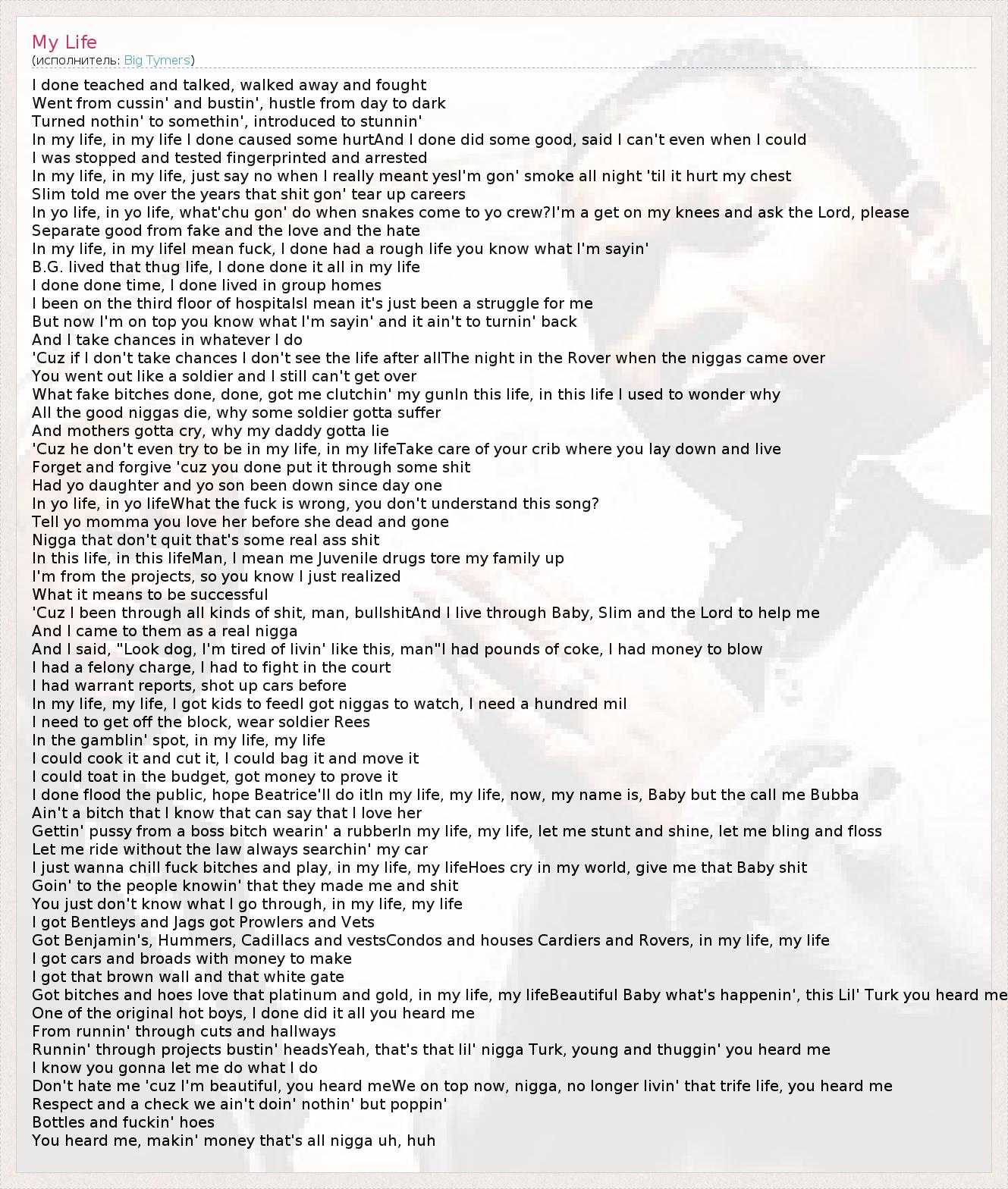 I done teached and talked, walked away and fought Went from cussin' and bustin', hustle from day to dark Turned nothin' to somethin', introduced to stunnin' In my life, in my life I done caused some hurtAnd I done did some good, said I can't even when I could I was stopped and tested fingerprinted and arrested In my life, in my life, just say no when I really meant yesI'm gon' smoke all night 'til it hurt my chest Slim told me over the years that shit gon' tear up careers In yo life, in yo life, what'chu gon' do when snakes come to yo crew?I'm a get on my knees and ask the Lord, please Separate good from fake and the love and the hate In my life, in my lifeI mean fuck, I done had a rough life you know what I'm sayin' B.G. lived that thug life, I done done it all in my life I done done time, I done lived in group homes I been on the third floor of hospitalsI mean it's just been a struggle for me But now I'm on top you know what I'm sayin' and it ain't to turnin' back And I take chances in whatever I do 'Cuz if I don't take chances I don't see the life after allThe night in the Rover when the niggas came over You went out like a soldier and I still can't get over What fake bitches done, done, got me clutchin' my gunIn this life, in this life I used to wonder why All the good niggas die, why some soldier gotta suffer And mothers gotta cry, why my daddy gotta lie 'Cuz he don't even try to be in my life, in my lifeTake care of your crib where you lay down and live Forget and forgive 'cuz you done put it through some shit Had yo daughter and yo son been down since day one In yo life, in yo lifeWhat the fuck is wrong, you don't understand this song? Tell yo momma you love her before she dead and gone Nigga that don't quit that's some real ass shit In this life, in this lifeMan, I mean me Juvenile drugs tore my family up I'm from the projects, so you know I just realized What it means to be successful 'Cuz I been through all kinds of shit, man, bullshitAnd I live through Baby, Slim and the Lord to help me And I came to them as a real nigga And I said, "Look dog, I'm tired of livin' like this, man"I had pounds of coke, I had money to blow I had a felony charge, I had to fight in the court I had warrant reports, shot up cars before In my life, my life, I got kids to feedI got niggas to watch, I need a hundred mil I need to get off the block, wear soldier Rees In the gamblin' spot, in my life, my life I could cook it and cut it, I could bag it and move it I could toat in the budget, got money to prove it I done flood the public, hope Beatrice'll do itIn my life, my life, now, my name is, Baby but the call me Bubba Ain't a bitch that I know that can say that I love her Gettin' pussy from a boss bitch wearin' a rubberIn my life, my life, let me stunt and shine, let me bling and floss Let me ride without the law always searchin' my car I just wanna chill fuck bitches and play, in my life, my lifeHoes cry in my world, give me that Baby shit Goin' to the people knowin' that they made me and shit You just don't know what I go through, in my life, my life I got Bentleys and Jags got Prowlers and Vets Got Benjamin's, Hummers, Cadillacs and vestsCondos and houses Cardiers and Rovers, in my life, my life I got cars and broads with money to make I got that brown wall and that white gate Got bitches and hoes love that platinum and gold, in my life, my lifeBeautiful Baby what's happenin', this Lil' Turk you heard me One of the original hot boys, I done did it all you heard me From runnin' through cuts and hallways Runnin' through projects bustin' headsYeah, that's that lil' nigga Turk, young and thuggin' you heard me I know you gonna let me do what I do Don't hate me 'cuz I'm beautiful, you heard meWe on top now, nigga, no longer livin' that trife life, you heard me Respect and a check we ain't doin' nothin' but poppin' Bottles and fuckin' hoes You heard me, makin' money that's all nigga uh, huh