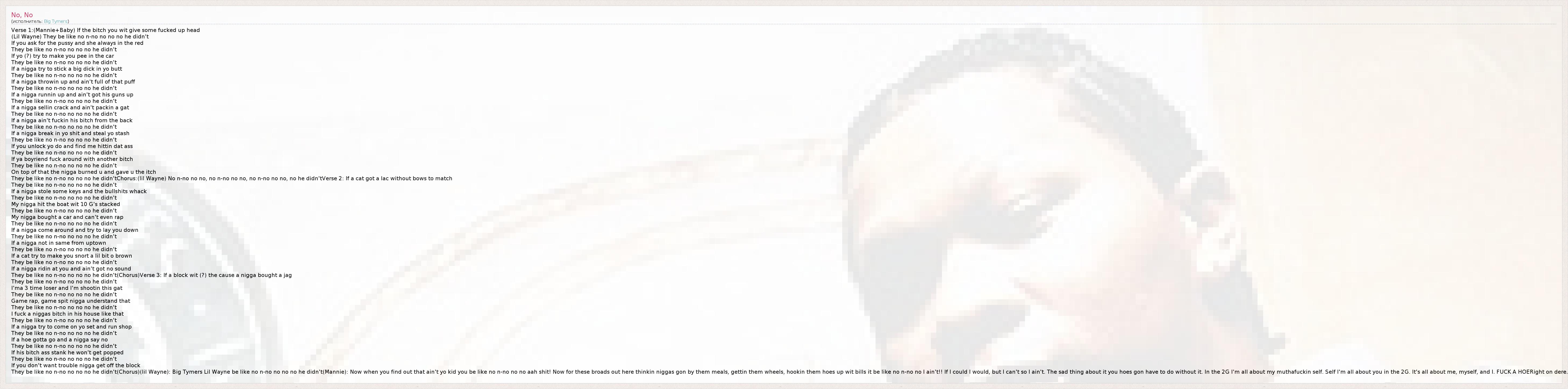 Verse 1:(Mannie+Baby) If the bitch you wit give some fucked up head (Lil Wayne) They be like no n-no no no no he didn't If you ask for the pussy and she always in the red They be like no n-no no no no he didn't If yo (?) try to make you pee in the car They be like no n-no no no no he didn't If a nigga try to stick a big dick in yo butt They be like no n-no no no no he didn't If a nigga throwin up and ain't full of that puff They be like no n-no no no no he didn't If a nigga runnin up and ain't got his guns up They be like no n-no no no no he didn't If a nigga sellin crack and ain't packin a gat They be like no n-no no no no he didn't If a nigga ain't fuckin his bitch from the back They be like no n-no no no no he didn't If a nigga break in yo shit and steal yo stash They be like no n-no no no no he didn't If you unlock yo do and find me hittin dat ass They be like no n-no no no no he didn't If ya boyriend fuck around with another bitch They be like no n-no no no no he didn't On top of that the nigga burned u and gave u the itch They be like no n-no no no no he didn'tChorus:(lil Wayne) No n-no no no, no n-no no no, no n-no no no, no he didn'tVerse 2: If a cat got a lac without bows to match They be like no n-no no no no he didn't If a nigga stole some keys and the bullshits whack They be like no n-no no no no he didn't My nigga hit the boat wit 10 G's stacked They be like no n-no no no no he didn't My nigga bought a car and can't even rap They be like no n-no no no no he didn't If a nigga come around and try to lay you down They be like no n-no no no no he didn't If a nigga not in same from uptown They be like no n-no no no no he didn't If a cat try to make you snort a lil bit o brown They be like no n-no no no no he didn't If a nigga ridin at you and ain't got no sound They be like no n-no no no no he didn't(Chorus)Verse 3: If a block wit (?) the cause a nigga bought a jag They be like no n-no no no no he didn't I'ma 3 time loser and I'm shootin this gat They be like no n-no no no no he didn't Game rap, game spit nigga understand that They be like no n-no no no no he didn't I fuck a niggas bitch in his house like that They be like no n-no no no no he didn't If a nigga try to come on yo set and run shop They be like no n-no no no no he didn't If a hoe gotta go and a nigga say no They be like no n-no no no no he didn't If his bitch ass stank he won't get popped They be like no n-no no no no he didn't If you don't want trouble nigga get off the block They be like no n-no no no no he didn't(Chorus)(lil Wayne): Big Tymers Lil Wayne be like no n-no no no no he didn't(Mannie): Now when you find out that ain't yo kid you be like no n-no no no aah shit! Now for these broads out here thinkin niggas gon by them meals, gettin them wheels, hookin them hoes up wit bills it be like no n-no no I ain't!! If I could I would, but I can't so I ain't. The sad thing about it you hoes gon have to do without it. In the 2G I'm all about my muthafuckin self. Self I'm all about you in the 2G. It's all about me, myself, and I. FUCK A HOERight on dere.