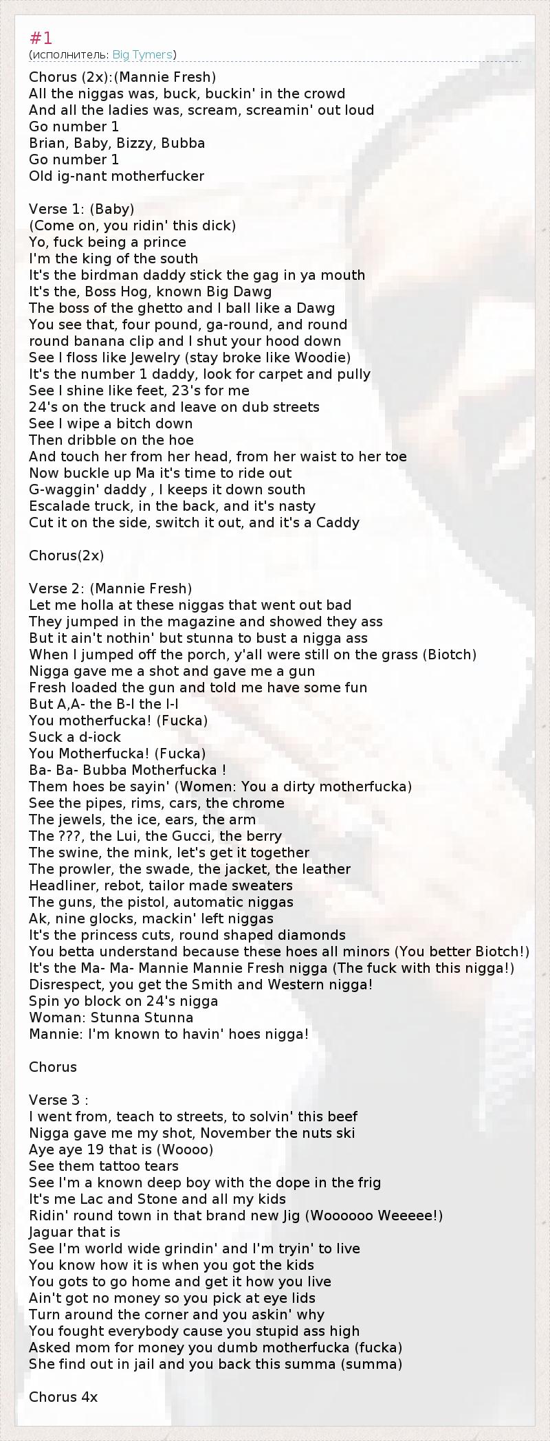 Chorus (2x):(Mannie Fresh) All the niggas was, buck, buckin' in the crowd And all the ladies was, scream, screamin' out loud Go number 1 Brian, Baby, Bizzy, Bubba Go number 1 Old ig-nant motherfucker Verse 1: (Baby) (Come on, you ridin' this dick) Yo, fuck being a prince I'm the king of the south It's the birdman daddy stick the gag in ya mouth It's the, Boss Hog, known Big Dawg The boss of the ghetto and I ball like a Dawg You see that, four pound, ga-round, and round round banana clip and I shut your hood down See I floss like Jewelry (stay broke like Woodie) It's the number 1 daddy, look for carpet and pully See I shine like feet, 23's for me 24's on the truck and leave on dub streets See I wipe a bitch down Then dribble on the hoe And touch her from her head, from her waist to her toe Now buckle up Ma it's time to ride out G-waggin' daddy , I keeps it down south Escalade truck, in the back, and it's nasty Cut it on the side, switch it out, and it's a Caddy Chorus(2x) Verse 2: (Mannie Fresh) Let me holla at these niggas that went out bad They jumped in the magazine and showed they ass But it ain't nothin' but stunna to bust a nigga ass When I jumped off the porch, y'all were still on the grass (Biotch) Nigga gave me a shot and gave me a gun Fresh loaded the gun and told me have some fun But A,A- the B-I the I-I You motherfucka! (Fucka) Suck a d-iock You Motherfucka! (Fucka) Ba- Ba- Bubba Motherfucka ! Them hoes be sayin' (Women: You a dirty motherfucka) See the pipes, rims, cars, the chrome The jewels, the ice, ears, the arm The ???, the Lui, the Gucci, the berry The swine, the mink, let's get it together The prowler, the swade, the jacket, the leather Headliner, rebot, tailor made sweaters The guns, the pistol, automatic niggas Ak, nine glocks, mackin' left niggas It's the princess cuts, round shaped diamonds You betta understand because these hoes all minors (You better Biotch!) It's the Ma- Ma- Mannie Mannie Fresh nigga (The fuck with this nigga!) Disrespect, you get the Smith and Western nigga! Spin yo block on 24's nigga Woman: Stunna Stunna Mannie: I'm known to havin' hoes nigga! Chorus Verse 3 : I went from, teach to streets, to solvin' this beef Nigga gave me my shot, November the nuts ski Aye aye 19 that is (Woooo) See them tattoo tears See I'm a known deep boy with the dope in the frig It's me Lac and Stone and all my kids Ridin' round town in that brand new Jig (Woooooo Weeeee!) Jaguar that is See I'm world wide grindin' and I'm tryin' to live You know how it is when you got the kids You gots to go home and get it how you live Ain't got no money so you pick at eye lids Turn around the corner and you askin' why You fought everybody cause you stupid ass high Asked mom for money you dumb motherfucka (fucka) She find out in jail and you back this summa (summa) Chorus 4x