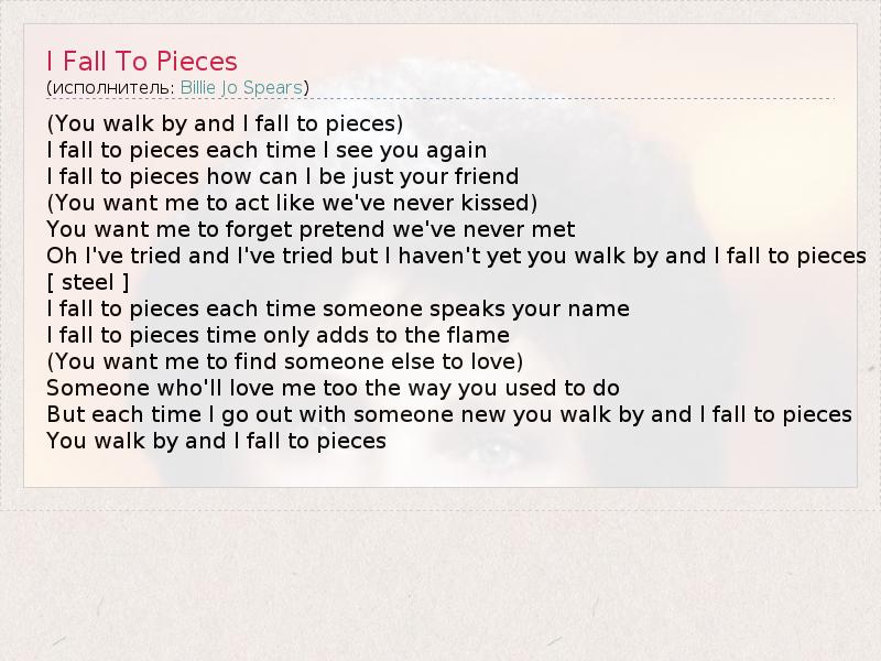 (You walk by and I fall to pieces) I fall to pieces each time I see you again I fall to pieces how can I be just your friend (You want me to act like we've never kissed) You want me to forget pretend we've never met Oh I've tried and I've tried but I haven't yet you walk by and I fall to pieces [ steel ] I fall to pieces each time someone speaks your name I fall to pieces time only adds to the flame (You want me to find someone else to love) Someone who'll love me too the way you used to do But each time I go out with someone new you walk by and I fall to pieces You walk by and I fall to pieces