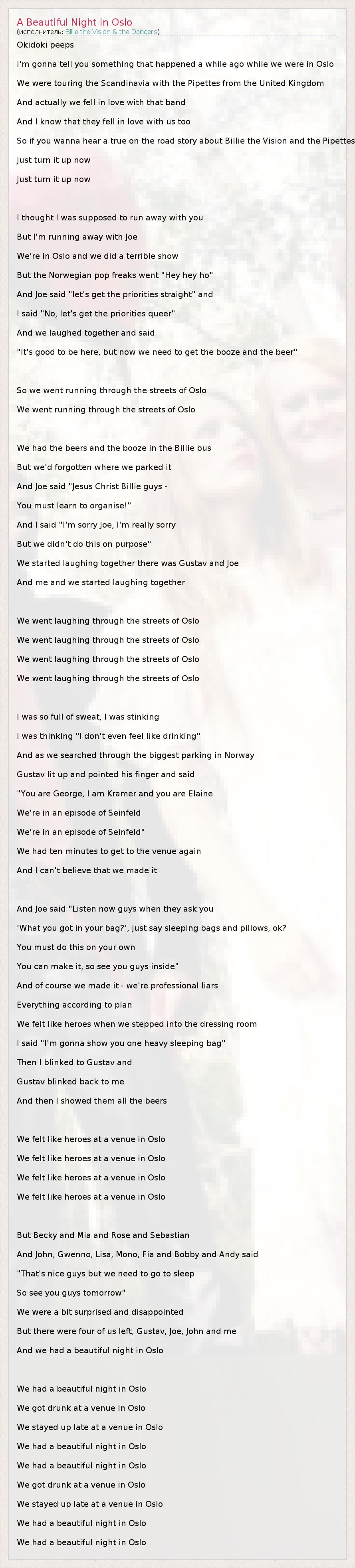 Okidoki peeps I'm gonna tell you something that happened a while ago while we were in Oslo We were touring the Scandinavia with the Pipettes from the United Kingdom And actually we fell in love with that band And I know that they fell in love with us too So if you wanna hear a true on the road story about Billie the Vision and the Pipettes Just turn it up now Just turn it up now I thought I was supposed to run away with you But I'm running away with Joe We're in Oslo and we did a terrible show But the Norwegian pop freaks went "Hey hey ho" And Joe said "let's get the priorities straight" and I said "No, let's get the priorities queer" And we laughed together and said "It's good to be here, but now we need to get the booze and the beer" So we went running through the streets of Oslo We went running through the streets of Oslo We had the beers and the booze in the Billie bus But we'd forgotten where we parked it And Joe said "Jesus Christ Billie guys - You must learn to organise!" And I said "I'm sorry Joe, I'm really sorry But we didn't do this on purpose" We started laughing together there was Gustav and Joe And me and we started laughing together We went laughing through the streets of Oslo We went laughing through the streets of Oslo We went laughing through the streets of Oslo We went laughing through the streets of Oslo I was so full of sweat, I was stinking I was thinking "I don't even feel like drinking" And as we searched through the biggest parking in Norway Gustav lit up and pointed his finger and said "You are George, I am Kramer and you are Elaine We're in an episode of Seinfeld We're in an episode of Seinfeld" We had ten minutes to get to the venue again And I can't believe that we made it And Joe said "Listen now guys when they ask you 'What you got in your bag?', just say sleeping bags and pillows, ok? You must do this on your own You can make it, so see you guys inside" And of course we made it - we're professional liars Everything according to plan We felt like heroes when we stepped into the dressing room I said "I'm gonna show you one heavy sleeping bag" Then I blinked to Gustav and Gustav blinked back to me And then I showed them all the beers We felt like heroes at a venue in Oslo We felt like heroes at a venue in Oslo We felt like heroes at a venue in Oslo We felt like heroes at a venue in Oslo But Becky and Mia and Rose and Sebastian And John, Gwenno, Lisa, Mono, Fia and Bobby and Andy said "That's nice guys but we need to go to sleep So see you guys tomorrow" We were a bit surprised and disappointed But there were four of us left, Gustav, Joe, John and me And we had a beautiful night in Oslo We had a beautiful night in Oslo We got drunk at a venue in Oslo We stayed up late at a venue in Oslo We had a beautiful night in Oslo We had a beautiful night in Oslo We got drunk at a venue in Oslo We stayed up late at a venue in Oslo We had a beautiful night in Oslo We had a beautiful night in Oslo