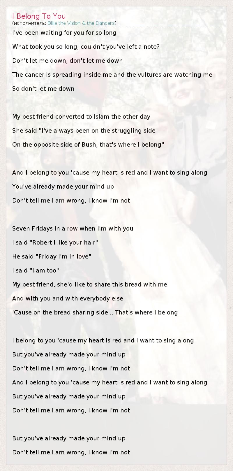 I've been waiting for you for so long What took you so long, couldn't you've left a note? Don't let me down, don't let me down The cancer is spreading inside me and the vultures are watching me So don't let me down My best friend converted to Islam the other day She said "I've always been on the struggling side On the opposite side of Bush, that's where I belong" And I belong to you 'cause my heart is red and I want to sing along You've already made your mind up Don't tell me I am wrong, I know I'm not Seven Fridays in a row when I'm with you I said "Robert I like your hair" He said "Friday I'm in love" I said "I am too" My best friend, she'd like to share this bread with me And with you and with everybody else 'Cause on the bread sharing side... That's where I belong I belong to you 'cause my heart is red and I want to sing along But you've already made your mind up Don't tell me I am wrong, I know I'm not And I belong to you 'cause my heart is red and I want to sing along But you've already made your mind up Don't tell me I am wrong, I know I'm not But you've already made your mind up Don't tell me I am wrong, I know I'm not