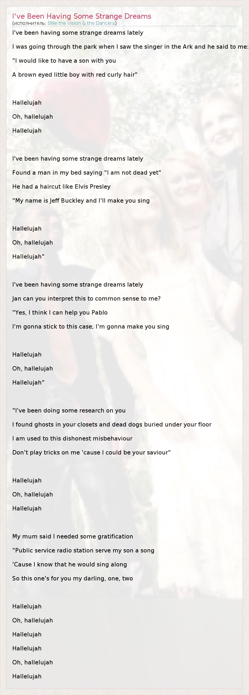 I've been having some strange dreams lately I was going through the park when I saw the singer in the Ark and he said to me: "I would like to have a son with you A brown eyed little boy with red curly hair" Hallelujah Oh, hallelujah Hallelujah I've been having some strange dreams lately Found a man in my bed saying "I am not dead yet" He had a haircut like Elvis Presley "My name is Jeff Buckley and I'll make you sing Hallelujah Oh, hallelujah Hallelujah" I've been having some strange dreams lately Jan can you interpret this to common sense to me? "Yes, I think I can help you Pablo I'm gonna stick to this case, I'm gonna make you sing Hallelujah Oh, hallelujah Hallelujah" "I've been doing some research on you I found ghosts in your closets and dead dogs buried under your floor I am used to this dishonest misbehaviour Don't play tricks on me 'cause I could be your saviour" Hallelujah Oh, hallelujah Hallelujah My mum said I needed some gratification "Public service radio station serve my son a song 'Cause I know that he would sing along So this one's for you my darling, one, two Hallelujah Oh, hallelujah Hallelujah Hallelujah Oh, hallelujah Hallelujah