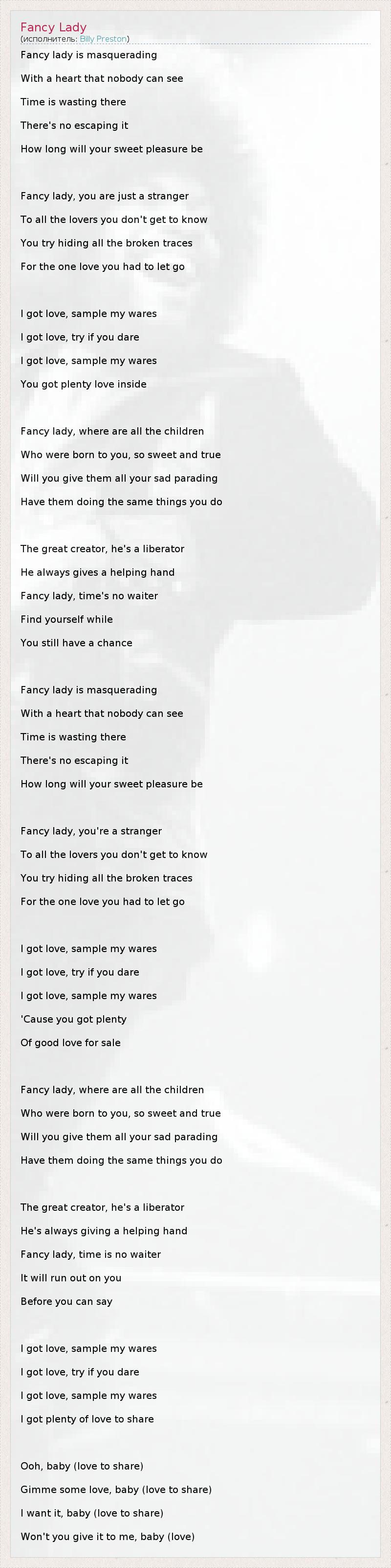 Fancy lady is masquerading With a heart that nobody can see Time is wasting there There's no escaping it How long will your sweet pleasure be Fancy lady, you are just a stranger To all the lovers you don't get to know You try hiding all the broken traces For the one love you had to let go I got love, sample my wares I got love, try if you dare I got love, sample my wares You got plenty love inside Fancy lady, where are all the children Who were born to you, so sweet and true Will you give them all your sad parading Have them doing the same things you do The great creator, he's a liberator He always gives a helping hand Fancy lady, time's no waiter Find yourself while You still have a chance Fancy lady is masquerading With a heart that nobody can see Time is wasting there There's no escaping it How long will your sweet pleasure be Fancy lady, you're a stranger To all the lovers you don't get to know You try hiding all the broken traces For the one love you had to let go I got love, sample my wares I got love, try if you dare I got love, sample my wares 'Cause you got plenty Of good love for sale Fancy lady, where are all the children Who were born to you, so sweet and true Will you give them all your sad parading Have them doing the same things you do The great creator, he's a liberator He's always giving a helping hand Fancy lady, time is no waiter It will run out on you Before you can say I got love, sample my wares I got love, try if you dare I got love, sample my wares I got plenty of love to share Ooh, baby (love to share) Gimme some love, baby (love to share) I want it, baby (love to share) Won't you give it to me, baby (love)
