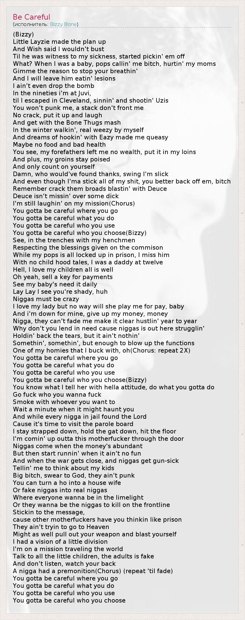 (Bizzy) Little Layzie made the plan up And Wish said I wouldn't bust Til he was witness to my sickness, started pickin' em off What? When I was a baby, pops callin' me bitch, hurtin' my moms Gimme the reason to stop your breathin' And I will leave him eatin' lesions I ain't even drop the bomb In the nineties i'm at Juvi, til I escaped in Cleveland, sinnin' and shootin' Uzis You won't punk me, a stack don't front me No crack, put it up and laugh And get with the Bone Thugs mash In the winter walkin', real weezy by myself And dreams of hookin' with Eazy made me queasy Maybe no food and bad health You see, my forefathers left me no wealth, put it in my loins And plus, my groins stay poised And only count on yourself Damn, who would've found thanks, swing I'm slick And even though I'ma stick all of my shit, you better back off em, bitch Remember crack them broads blastin' with Deuce Deuce isn't missin' over some dick I'm still laughin' on my mission(Chorus) You gotta be careful where you go You gotta be careful what you do You gotta be careful who you use You gotta be careful who you choose(Bizzy) See, in the trenches with my henchmen Respecting the blessings given on the commison While my pops is all locked up in prison, I miss him With no child hood tales, I was a daddy at twelve Hell, I love my children all is well Oh yeah, sell a key for payments See my baby's need it daily Lay Lay I see you're shady, huh Niggas must be crazy I love my lady but no way will she play me for pay, baby And i'm down for mine, give up my money, money Nigga, they can't fade me make it clear hustlin' year to year Why don't you lend in need cause niggas is out here strugglin' Holdin' back the tears, but it ain't nothin' Somethin', somethin', but enough to blow up the functions One of my homies that I buck with, oh(Chorus: repeat 2X) You gotta be careful where you go You gotta be careful what you do You gotta be careful who you use You gotta be careful who you choose(Bizzy) You know what I tell her with hella attitude, do what you gotta do Go fuck who you wanna fuck Smoke with whoever you want to Wait a minute when it might haunt you And while every nigga in jail found the Lord Cause it's time to visit the parole board I stay strapped down, hold the gat down, hit the floor I'm comin' up outta this motherfucker through the door Niggas come when the money's abundant But then start runnin' when it ain't no fun And when the war gets close, and niggas get gun-sick Tellin' me to think about my kids Big bitch, swear to God, they ain't punk You can turn a ho into a house wife Or fake niggas into real niggas Where everyone wanna be in the limelight Or they wanna be the niggas to kill on the frontline Stickin to the message, cause other motherfuckers have you thinkin like prison They ain't tryin to go to Heaven Might as well pull out your weapon and blast yourself I had a vision of a little division I'm on a mission traveling the world Talk to all the little children, the adults is fake And don't listen, watch your back A nigga had a premonition(Chorus) (repeat 'til fade) You gotta be careful where you go You gotta be careful what you do You gotta be careful who you use You gotta be careful who you choose
