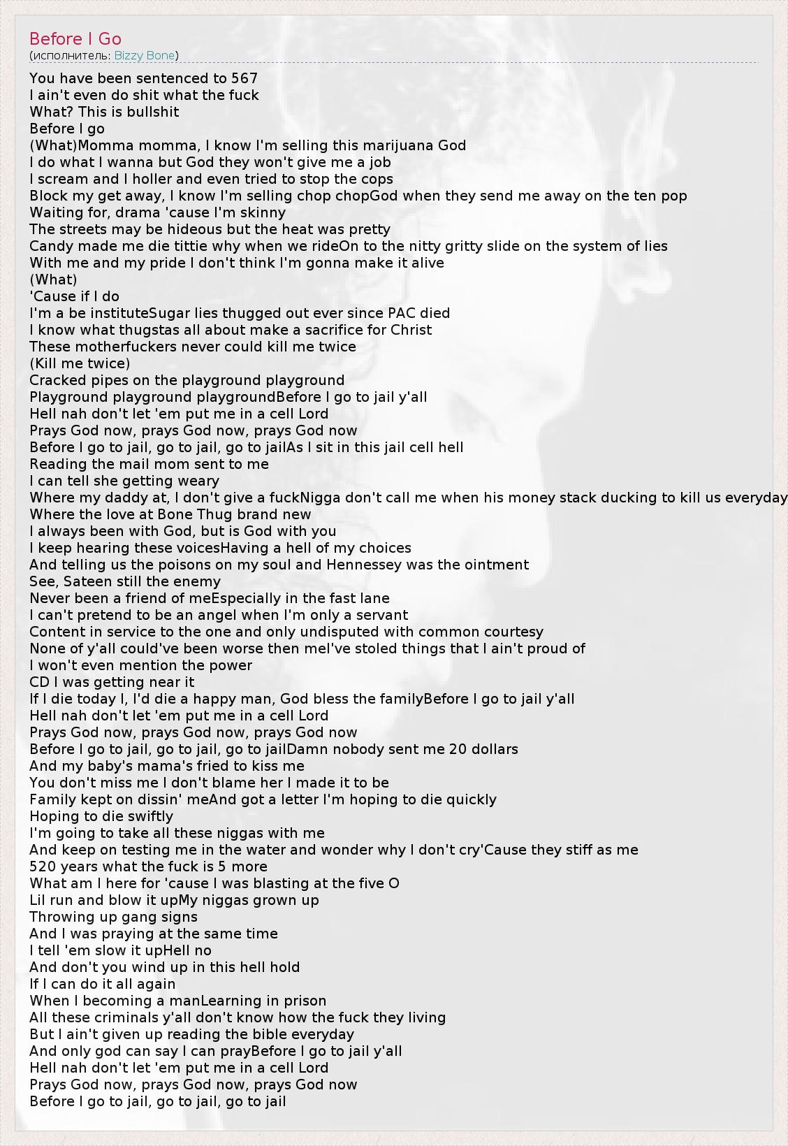 You have been sentenced to 567 I ain't even do shit what the fuck What? This is bullshit Before I go (What)Momma momma, I know I'm selling this marijuana God I do what I wanna but God they won't give me a job I scream and I holler and even tried to stop the cops Block my get away, I know I'm selling chop chopGod when they send me away on the ten pop Waiting for, drama 'cause I'm skinny The streets may be hideous but the heat was pretty Candy made me die tittie why when we rideOn to the nitty gritty slide on the system of lies With me and my pride I don't think I'm gonna make it alive (What) 'Cause if I do I'm a be instituteSugar lies thugged out ever since PAC died I know what thugstas all about make a sacrifice for Christ These motherfuckers never could kill me twice (Kill me twice) Cracked pipes on the playground playground Playground playground playgroundBefore I go to jail y'all Hell nah don't let 'em put me in a cell Lord Prays God now, prays God now, prays God now Before I go to jail, go to jail, go to jailAs I sit in this jail cell hell Reading the mail mom sent to me I can tell she getting weary Where my daddy at, I don't give a fuckNigga don't call me when his money stack ducking to kill us everyday Where the love at Bone Thug brand new I always been with God, but is God with you I keep hearing these voicesHaving a hell of my choices And telling us the poisons on my soul and Hennessey was the ointment See, Sateen still the enemy Never been a friend of meEspecially in the fast lane I can't pretend to be an angel when I'm only a servant Content in service to the one and only undisputed with common courtesy None of y'all could've been worse then meI've stoled things that I ain't proud of I won't even mention the power CD I was getting near it If I die today I, I'd die a happy man, God bless the familyBefore I go to jail y'all Hell nah don't let 'em put me in a cell Lord Prays God now, prays God now, prays God now Before I go to jail, go to jail, go to jailDamn nobody sent me 20 dollars And my baby's mama's fried to kiss me You don't miss me I don't blame her I made it to be Family kept on dissin' meAnd got a letter I'm hoping to die quickly Hoping to die swiftly I'm going to take all these niggas with me And keep on testing me in the water and wonder why I don't cry'Cause they stiff as me 520 years what the fuck is 5 more What am I here for 'cause I was blasting at the five O Lil run and blow it upMy niggas grown up Throwing up gang signs And I was praying at the same time I tell 'em slow it upHell no And don't you wind up in this hell hold If I can do it all again When I becoming a manLearning in prison All these criminals y'all don't know how the fuck they living But I ain't given up reading the bible everyday And only god can say I can prayBefore I go to jail y'all Hell nah don't let 'em put me in a cell Lord Prays God now, prays God now, prays God now Before I go to jail, go to jail, go to jail