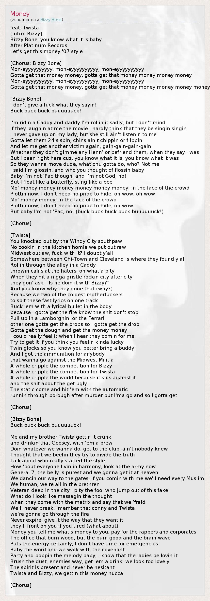 feat. Twista [Intro: Bizzy] Bizzy Bone, you know what it is baby After Platinum Records Let's get this money '07 style [Chorus: Bizzy Bone] Mon-eyyyyyyyyyy, mon-eyyyyyyyyyy, mon-eyyyyyyyyyy Gotta get that money money, gotta get that money money money money Mon-eyyyyyyyyyy, mon-eyyyyyyyyyy, mon-eyyyyyyyyyy Gotta get that money money, gotta get that money money money money money [Bizzy Bone] I don't give a fuck what they sayin! Buck buck buck buuuuuuck! I'm ridin a Caddy and daddy I'm rollin it sadly, but I don't mind If they laughin at me the movie I hardly think that they be singin singin I never gave up on my lady, but she still ain't listenin to me Gotta let them 24's spin, chins ain't chippin or flippin And let me get another victim again, gain-gain-gain-gain Whether they don't gimme any Henn' or befriend them, when they say I was But I been right here cuz, you know what it is, you know what it was So they wanna move dude, what'chu gotta do, who? Not me I said I'm glossin, and who you thought of flossin baby Baby I'm not 'Pac though, and I'm not God, no! But I float like a butterfly, sting like a bee Mo' money money money money money money, in the face of the crowd Plottin now, I don't need no pride to hide, oh wow, oh wow Mo' money money, in the face of the crowd Plottin now, I don't need no pride to hide, oh wow But baby I'm not 'Pac, no! (buck buck buck buck buuuuuuck!) [Chorus] [Twista] You knocked out by the Windy City southpaw No cookin in the kitchen homie we put out raw Midwest outlaw, fuck with it? I doubt y'all Somewhere between Chi-Town and Cleveland is where they found y'all Rollin through the alley in a Caddy throwin cali's at the haters, oh what a pity When they hit a nigga gristle rockin city after city they gon' ask, "Is he doin it with Bizzy?" And you know why they done that (why?) Because we two of the coldest motherfuckers to spit these fast lyrics on one track Buck 'em with a lyrical bullet in the body because I gotta get the fire know the shit don't stop Pull up in a Lamborghini or the Ferrari other one gotta get the props so I gotta get the drop Gotta get the dough and get the money money I could really feel it when I hear they comin for me Try to get it if you think you feelin kinda lucky Twin glocks so you know you better bring a buddy And I got the ammunition for anybody that wanna go against the Midwest Militia A whole cripple the competition for Bizzy A whole cripple the competition for Twista A whole cripple the world because it's us against it and the shit about the get ugly The static come and hit 'em with the automatic runnin through borough after murder but I'ma go and so I gotta get [Chorus] [Bizzy Bone] Buck buck buck buuuuuuck! Me and my brother Twista gettin it crunk and drinkin that Goosey, with 'em a brew Doin whatever we wanna do, get to the club, ain't nobody knew Thought that we beefin they try to divide the truth Talk about who really started the style How 'bout everyone livin in harmony, look at the army now General 7, the belly is purest and we gonna get it at heaven We dancin our way to the gates, if you comin with me we'll need every Muslim We human, we're all in the brethren Veteran deep in the city I pity the fool who jump out of this fake What do I look like massagin the thought when they come with the matrix and say that we 'fraid We'll never break, 'member that conny and Twista we're gonna go through the fire Never expire, give it the way that they want it they'll front on you if you tired (what about) Money you tell me what's money to you, pay for the rappers and corporates The office that burn wood, but the burn good and the brain wave Puts the energy certainly, I don't have time for emergencies Baby the word and we walk with the covenant Party and poppin the melody baby, I know that the ladies be lovin it Brush the dust, enemies way, get 'em a drink, we look too lovely The spirit is present and never be hesitant Twista and Bizzy, we gettin this money nucca [Chorus]