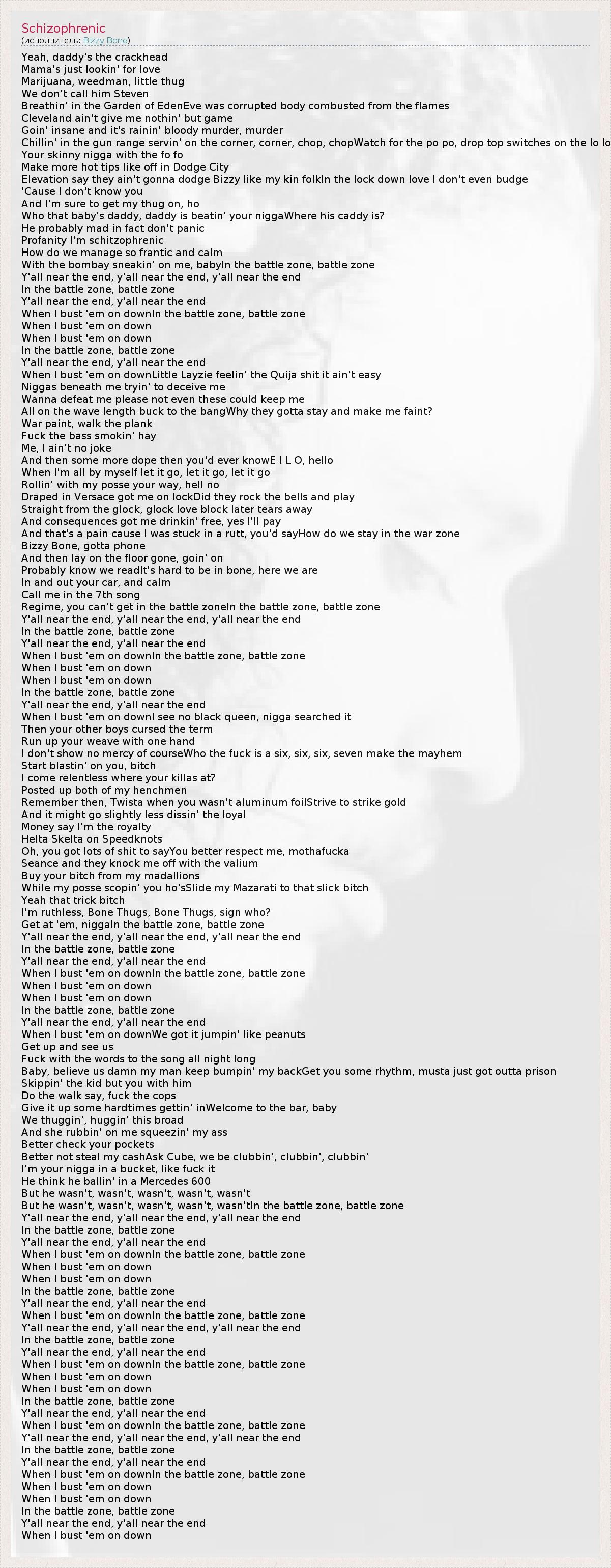 Yeah, daddy's the crackhead Mama's just lookin' for love Marijuana, weedman, little thug We don't call him Steven Breathin' in the Garden of EdenEve was corrupted body combusted from the flames Cleveland ain't give me nothin' but game Goin' insane and it's rainin' bloody murder, murder Chillin' in the gun range servin' on the corner, corner, chop, chopWatch for the po po, drop top switches on the lo lo Your skinny nigga with the fo fo Make more hot tips like off in Dodge City Elevation say they ain't gonna dodge Bizzy like my kin folkIn the lock down love I don't even budge 'Cause I don't know you And I'm sure to get my thug on, ho Who that baby's daddy, daddy is beatin' your niggaWhere his caddy is? He probably mad in fact don't panic Profanity I'm schitzophrenic How do we manage so frantic and calm With the bombay sneakin' on me, babyIn the battle zone, battle zone Y'all near the end, y'all near the end, y'all near the end In the battle zone, battle zone Y'all near the end, y'all near the end When I bust 'em on downIn the battle zone, battle zone When I bust 'em on down When I bust 'em on down In the battle zone, battle zone Y'all near the end, y'all near the end When I bust 'em on downLittle Layzie feelin' the Quija shit it ain't easy Niggas beneath me tryin' to deceive me Wanna defeat me please not even these could keep me All on the wave length buck to the bangWhy they gotta stay and make me faint? War paint, walk the plank Fuck the bass smokin' hay Me, I ain't no joke And then some more dope then you'd ever knowE I L O, hello When I'm all by myself let it go, let it go, let it go Rollin' with my posse your way, hell no Draped in Versace got me on lockDid they rock the bells and play Straight from the glock, glock love block later tears away And consequences got me drinkin' free, yes I'll pay And that's a pain cause I was stuck in a rutt, you'd sayHow do we stay in the war zone Bizzy Bone, gotta phone And then lay on the floor gone, goin' on Probably know we readIt's hard to be in bone, here we are In and out your car, and calm Call me in the 7th song Regime, you can't get in the battle zoneIn the battle zone, battle zone Y'all near the end, y'all near the end, y'all near the end In the battle zone, battle zone Y'all near the end, y'all near the end When I bust 'em on downIn the battle zone, battle zone When I bust 'em on down When I bust 'em on down In the battle zone, battle zone Y'all near the end, y'all near the end When I bust 'em on downI see no black queen, nigga searched it Then your other boys cursed the term Run up your weave with one hand I don't show no mercy of courseWho the fuck is a six, six, six, seven make the mayhem Start blastin' on you, bitch I come relentless where your killas at? Posted up both of my henchmen Remember then, Twista when you wasn't aluminum foilStrive to strike gold And it might go slightly less dissin' the loyal Money say I'm the royalty Helta Skelta on Speedknots Oh, you got lots of shit to sayYou better respect me, mothafucka Seance and they knock me off with the valium Buy your bitch from my madallions While my posse scopin' you ho'sSlide my Mazarati to that slick bitch Yeah that trick bitch I'm ruthless, Bone Thugs, Bone Thugs, sign who? Get at 'em, niggaIn the battle zone, battle zone Y'all near the end, y'all near the end, y'all near the end In the battle zone, battle zone Y'all near the end, y'all near the end When I bust 'em on downIn the battle zone, battle zone When I bust 'em on down When I bust 'em on down In the battle zone, battle zone Y'all near the end, y'all near the end When I bust 'em on downWe got it jumpin' like peanuts Get up and see us Fuck with the words to the song all night long Baby, believe us damn my man keep bumpin' my backGet you some rhythm, musta just got outta prison Skippin' the kid but you with him Do the walk say, fuck the cops Give it up some hardtimes gettin' inWelcome to the bar, baby We thuggin', huggin' this broad And she rubbin' on me squeezin' my ass Better check your pockets Better not steal my cashAsk Cube, we be clubbin', clubbin', clubbin' I'm your nigga in a bucket, like fuck it He think he ballin' in a Mercedes 600 But he wasn't, wasn't, wasn't, wasn't, wasn't But he wasn't, wasn't, wasn't, wasn't, wasn'tIn the battle zone, battle zone Y'all near the end, y'all near the end, y'all near the end In the battle zone, battle zone Y'all near the end, y'all near the end When I bust 'em on downIn the battle zone, battle zone When I bust 'em on down When I bust 'em on down In the battle zone, battle zone Y'all near the end, y'all near the end When I bust 'em on downIn the battle zone, battle zone Y'all near the end, y'all near the end, y'all near the end In the battle zone, battle zone Y'all near the end, y'all near the end When I bust 'em on downIn the battle zone, battle zone When I bust 'em on down When I bust 'em on down In the battle zone, battle zone Y'all near the end, y'all near the end When I bust 'em on downIn the battle zone, battle zone Y'all near the end, y'all near the end, y'all near the end In the battle zone, battle zone Y'all near the end, y'all near the end When I bust 'em on downIn the battle zone, battle zone When I bust 'em on down When I bust 'em on down In the battle zone, battle zone Y'all near the end, y'all near the end When I bust 'em on down